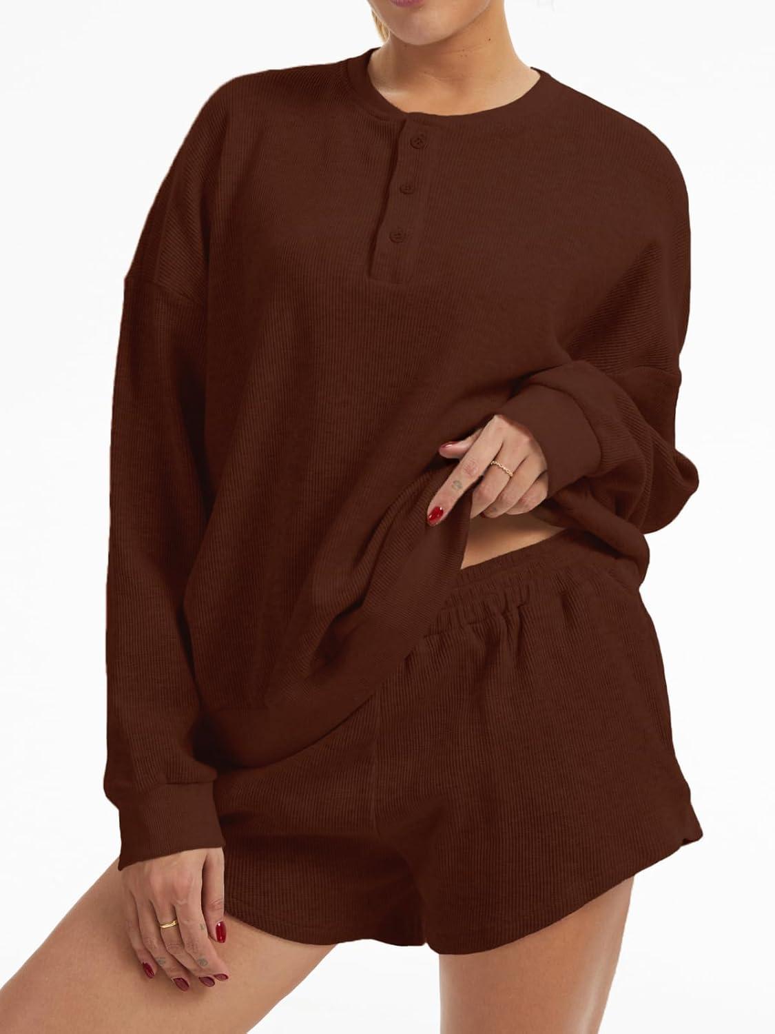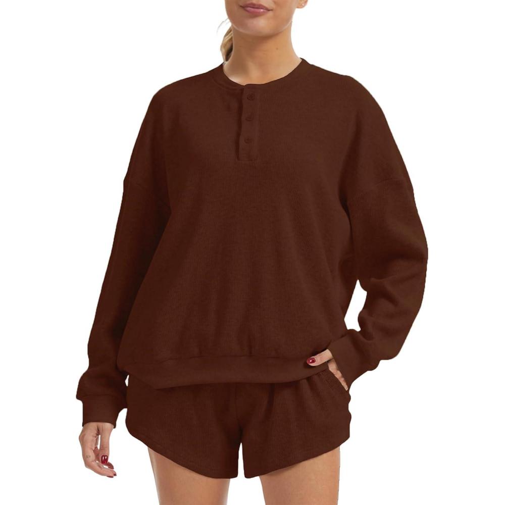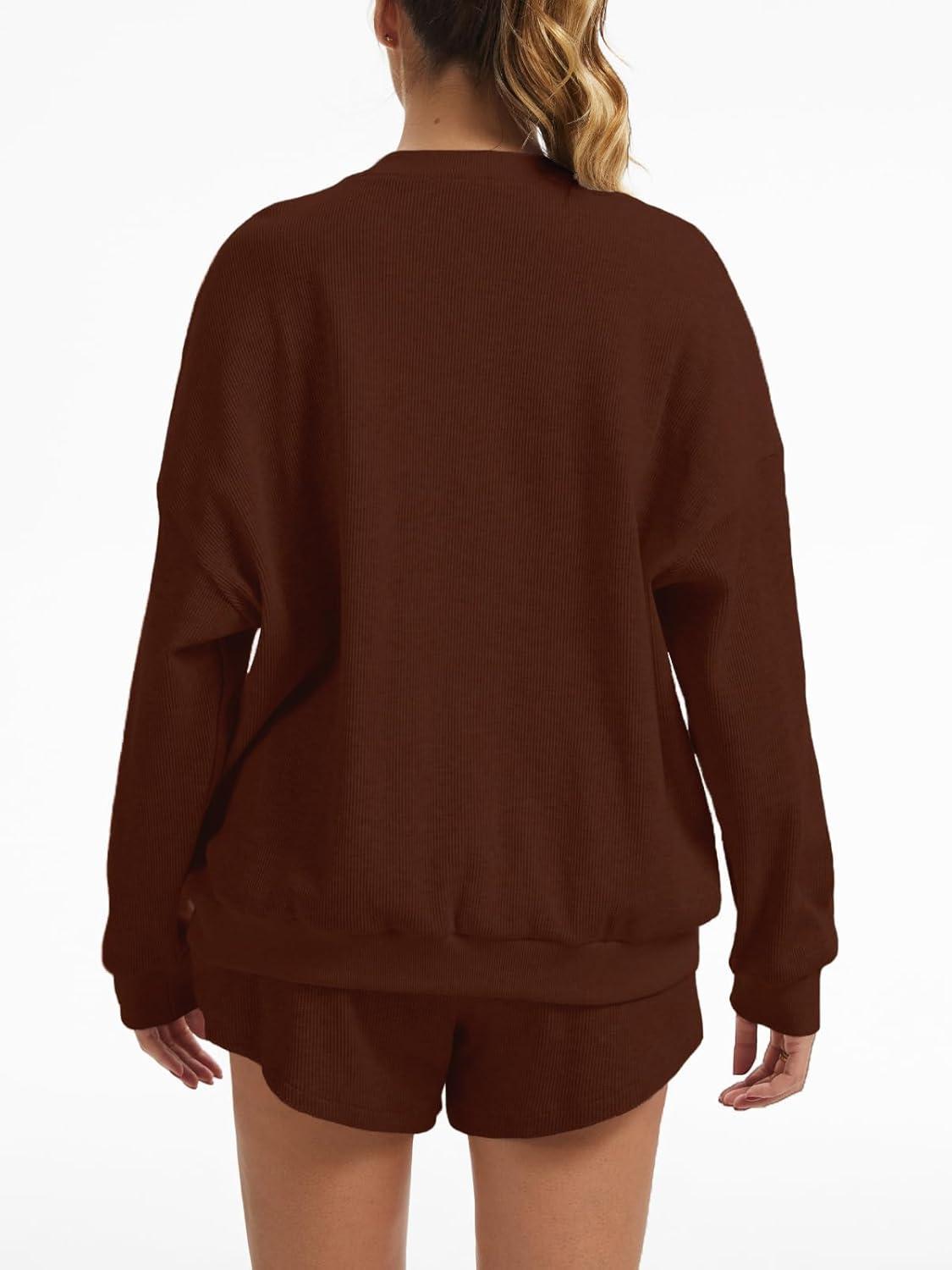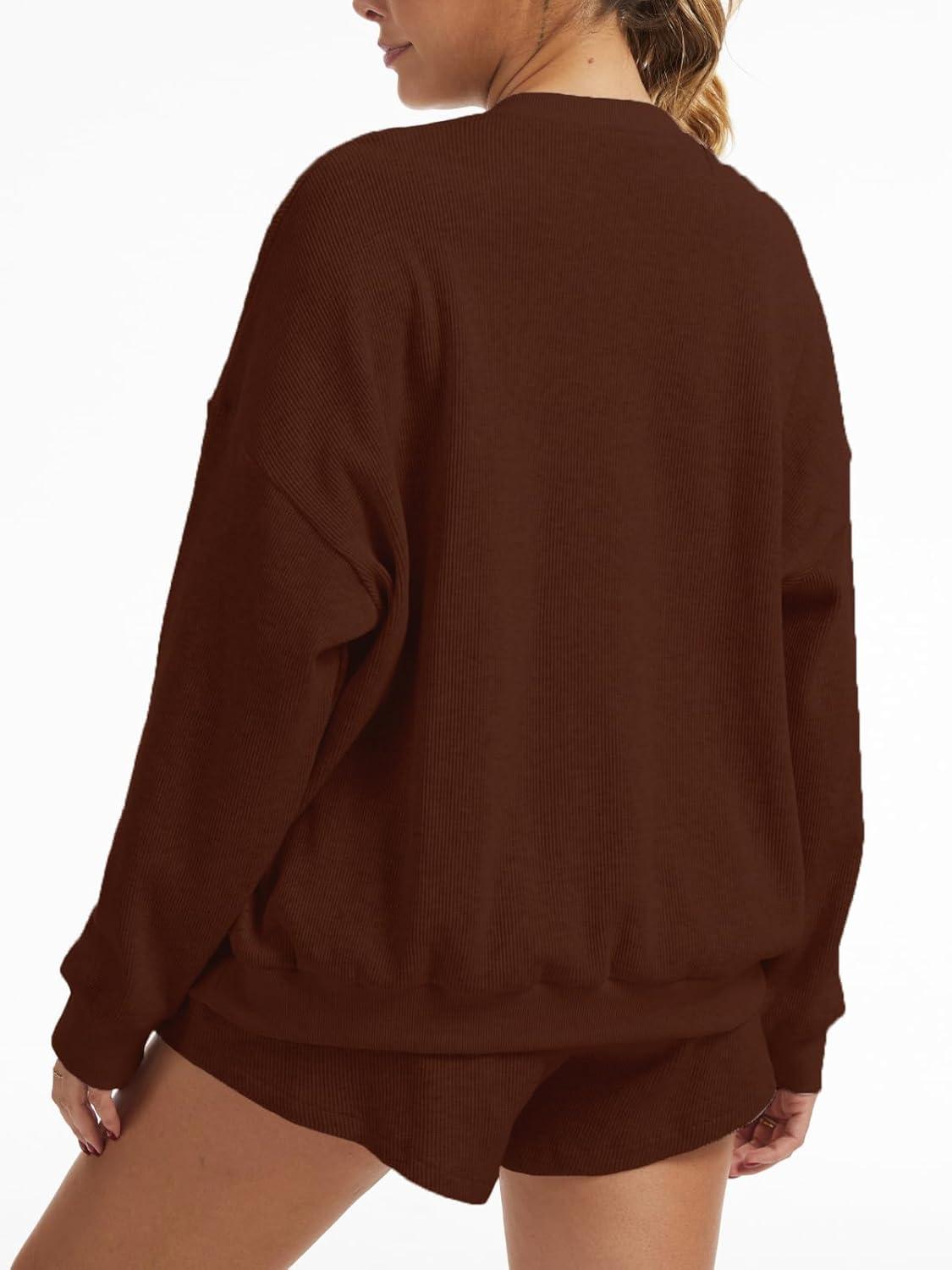 AnotherChill Women's Oversized Waffle Knit Lounge Set Long Sleeve Sweatshirt and High Waisted Shorts 2 Piece Casual Outfit(Brown)