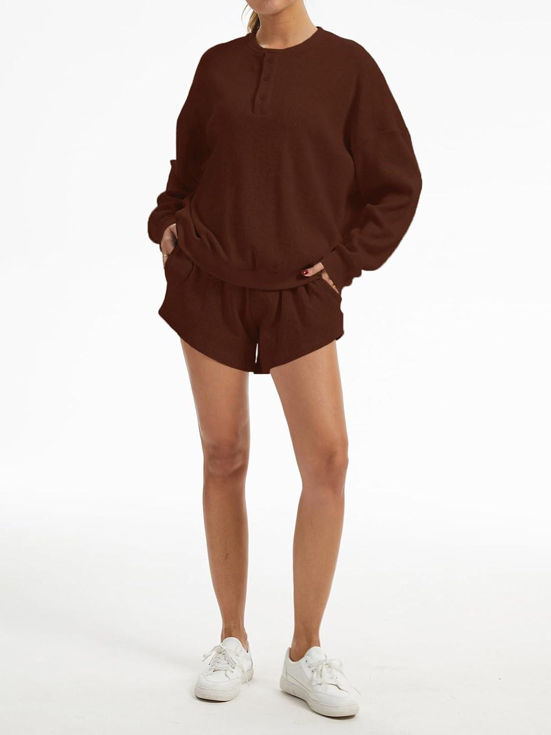 Made from a lightweight, breathable waffle knit fabric, this set includes an oversized Henley sweatshirt with loose-fitting sleeves and functional buttons, offering a relaxed and modern look. The high-waisted shorts feature a curved hem and slightly shorter sides to flatter your legs and add a sporty-chic edge.