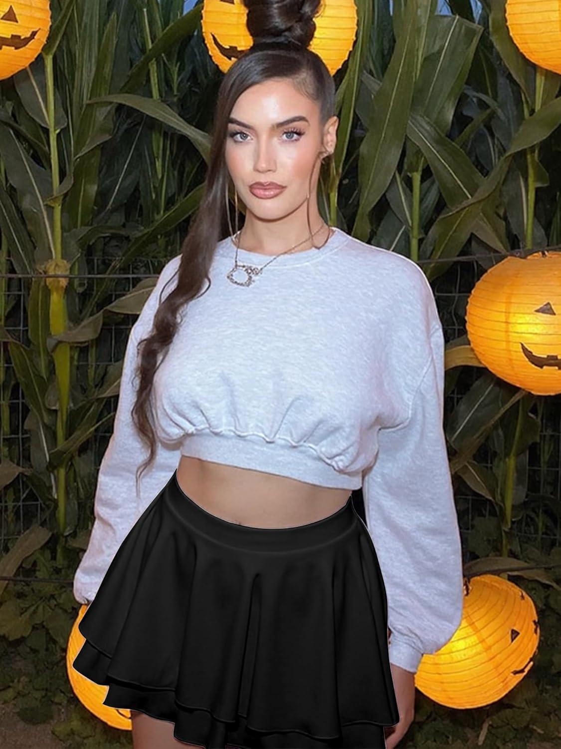 imageKaximil Womens Cute Flowy Mini Skirts High Waist Layered Ruffle Flared Skorts Skirt with Shorts UnderneathBlack