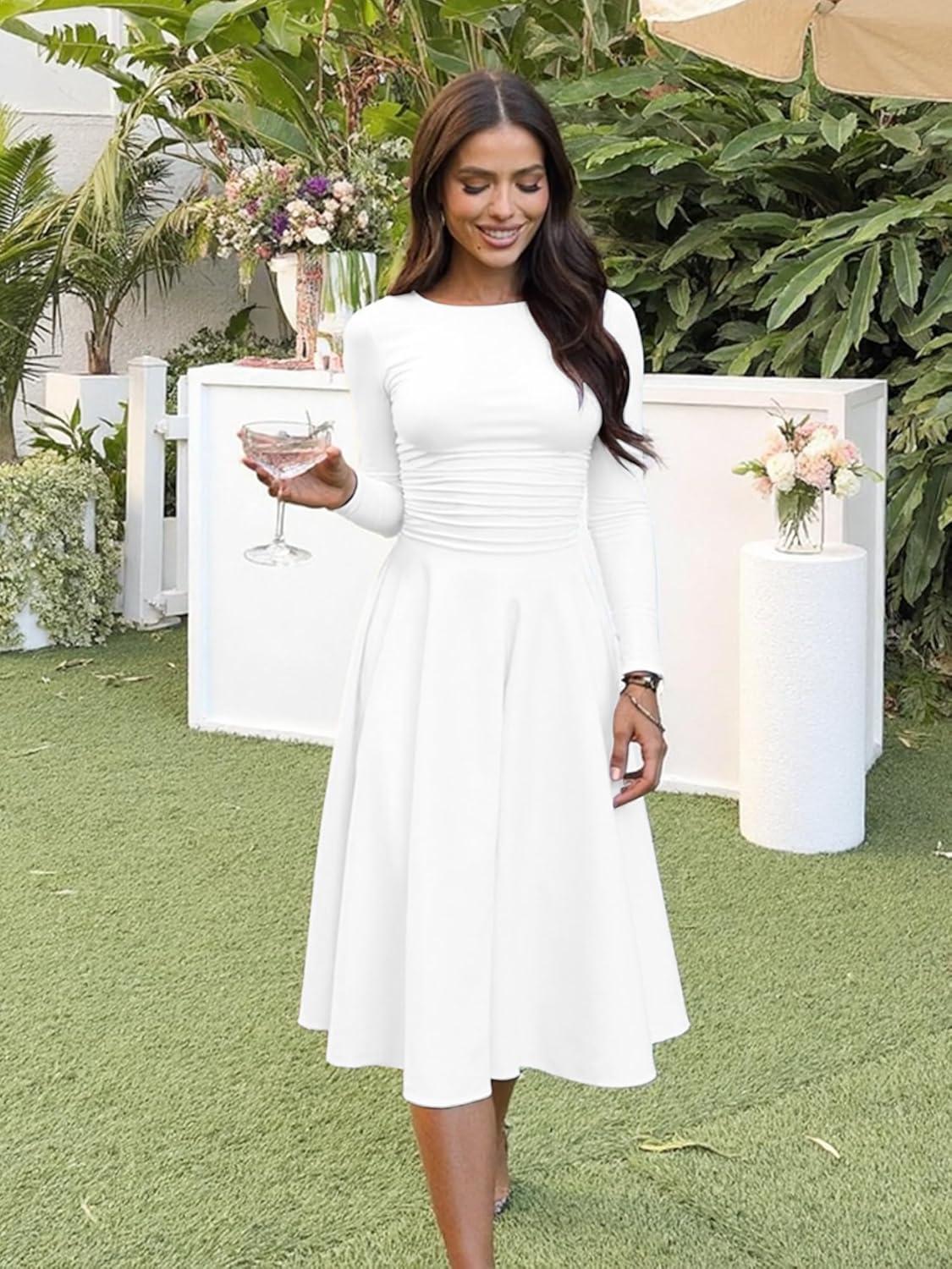 Kaximil Women's Long Sleeve Corset A Line Maxi Dress Ruffle Ruched Waist Flowy Long Dress(White)