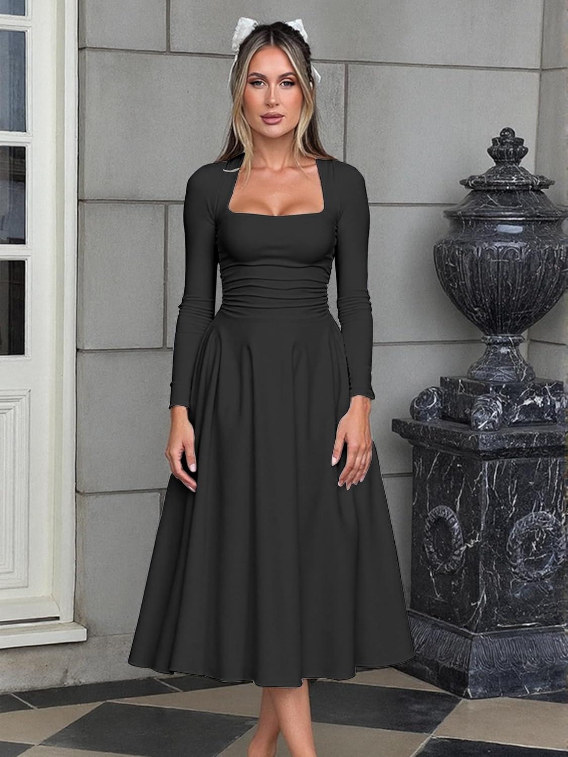 Kaximil Women's Long Sleeve Square Neck Corset A Line Maxi Dress Ruffle Flowy Formal Long Dresses(Black)