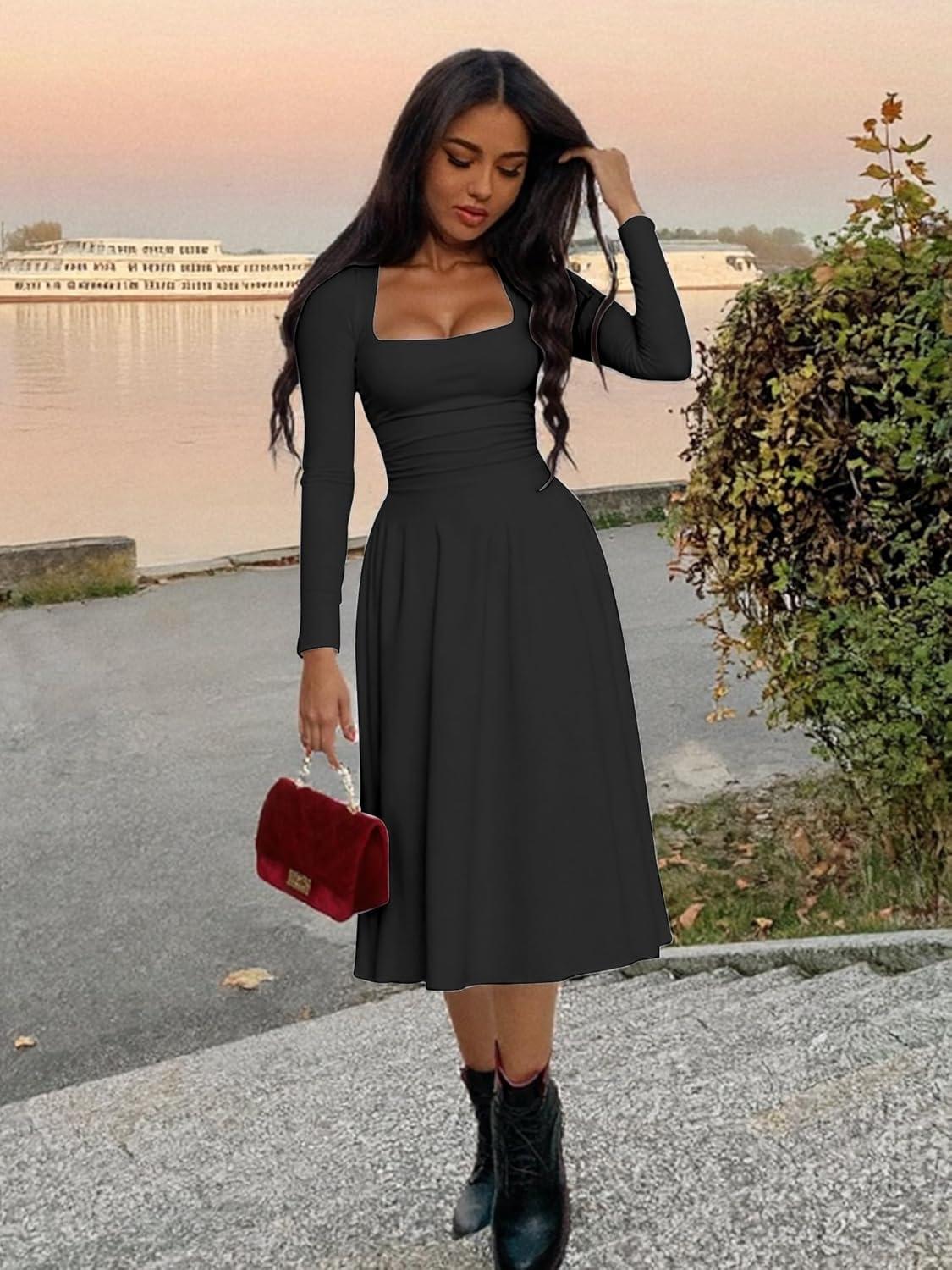 Kaximil Women’s Long Sleeve Square Neck Corset A Line Maxi Dress Ruffle Flowy Formal Long Dresses(Black)