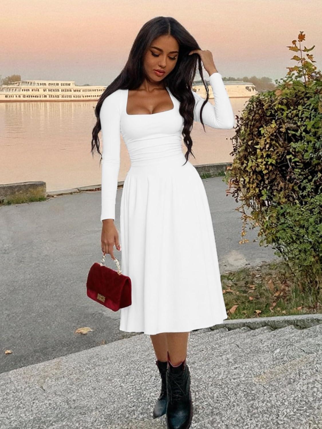 Kaximil Women’s Long Sleeve Square Neck Corset A Line Maxi Dress Ruffle Flowy Formal Long Dresses(White)