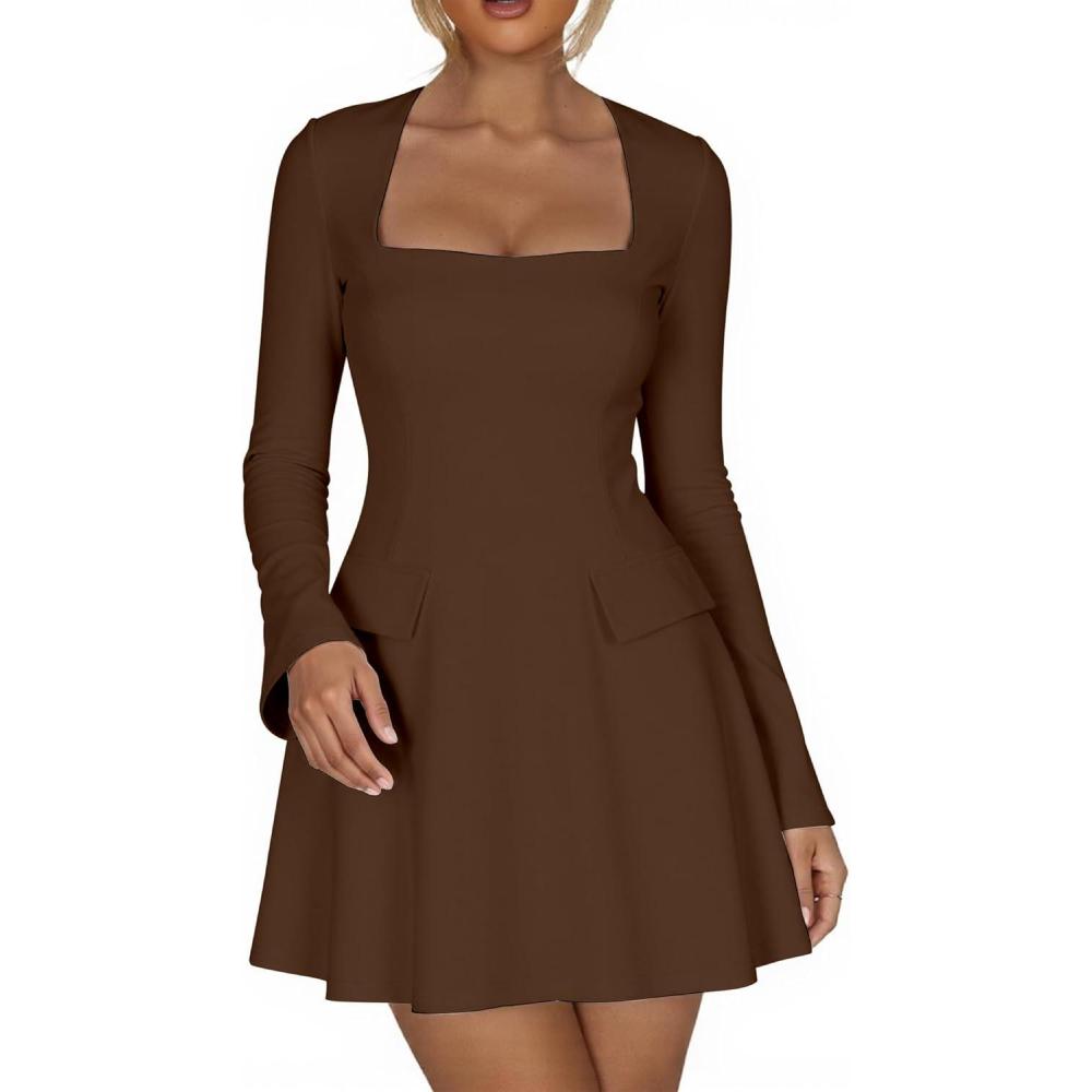Kaximil Women's Long Sleeve Square Neck Mini Dress A Line Ruffle Work Short Party Dresses(Coffee)