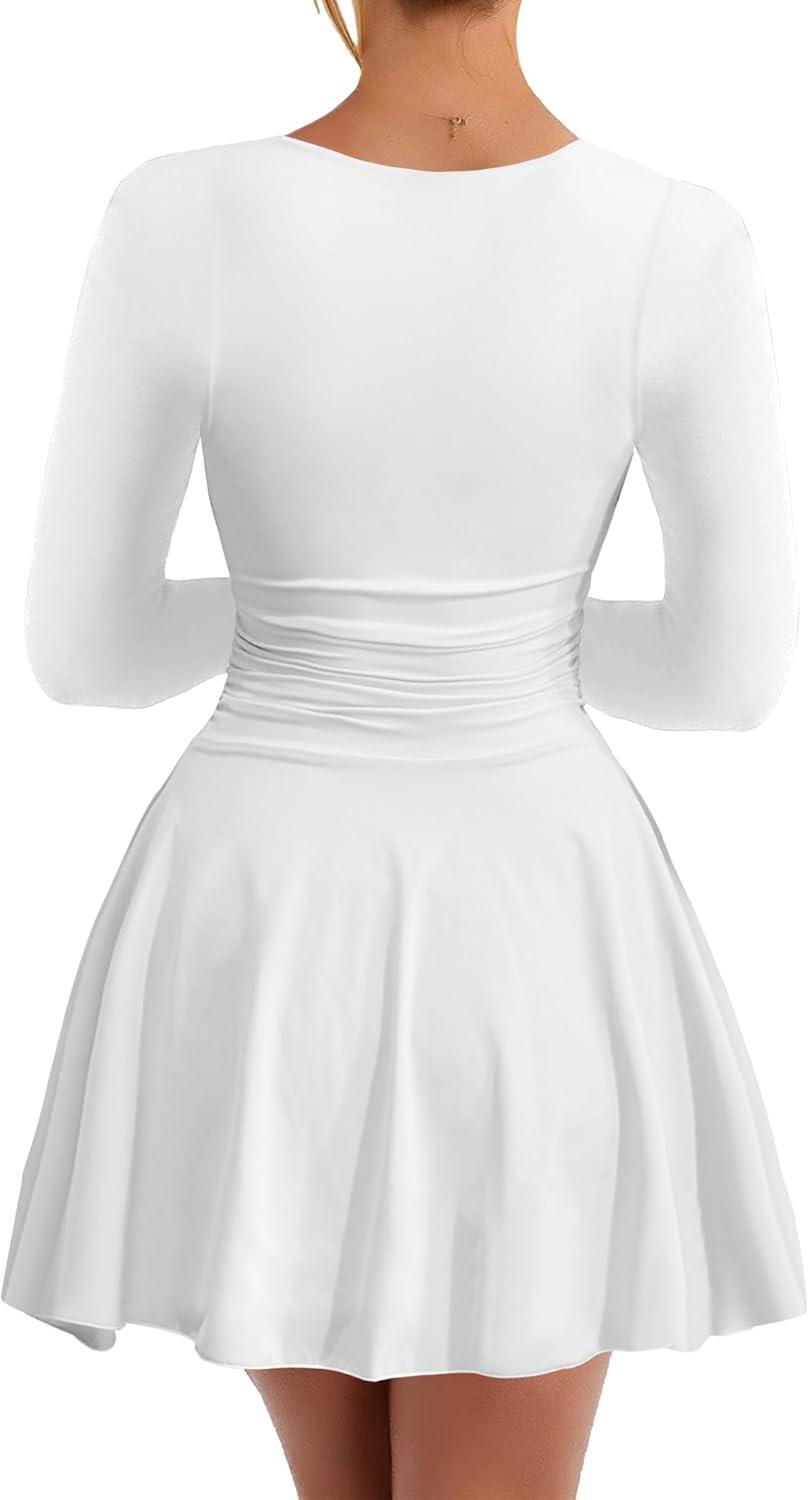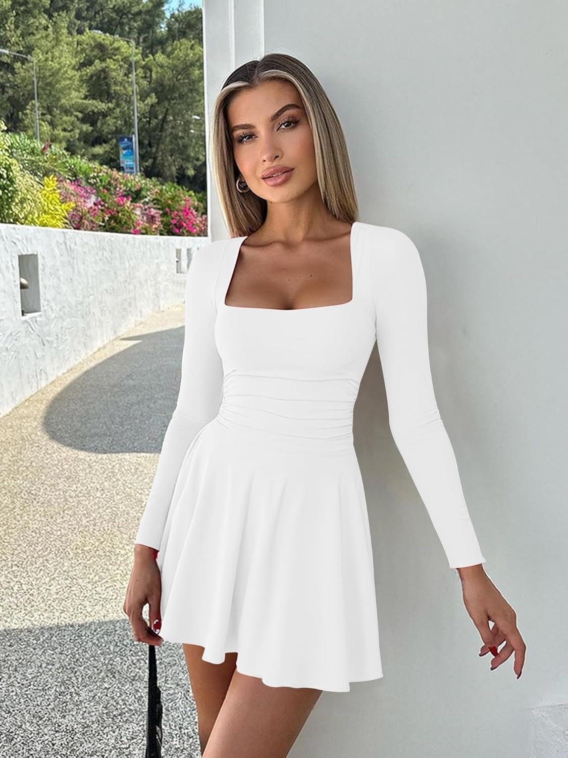 Kaximil Women’s Square Neck Long Sleeve Mini Dress Ruffle Hem Corset Short Party Club Dresses(White)