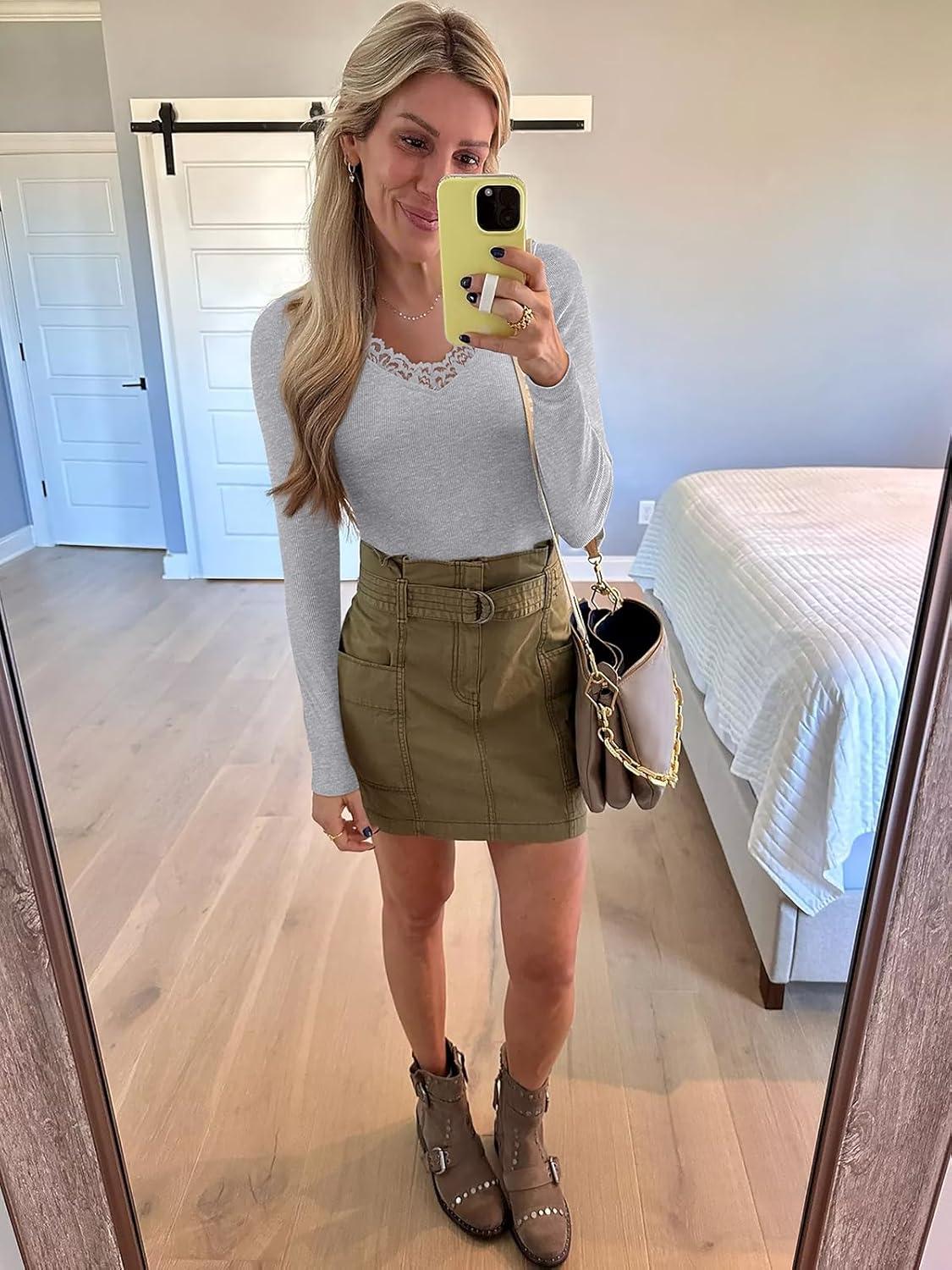 Long Sleeve Shirts for Women Lace V Neck Ribbed Fitted T-Shirt Dressy Business Casual Blouses 2025 Trendy Fall Tops(Grayish Green)