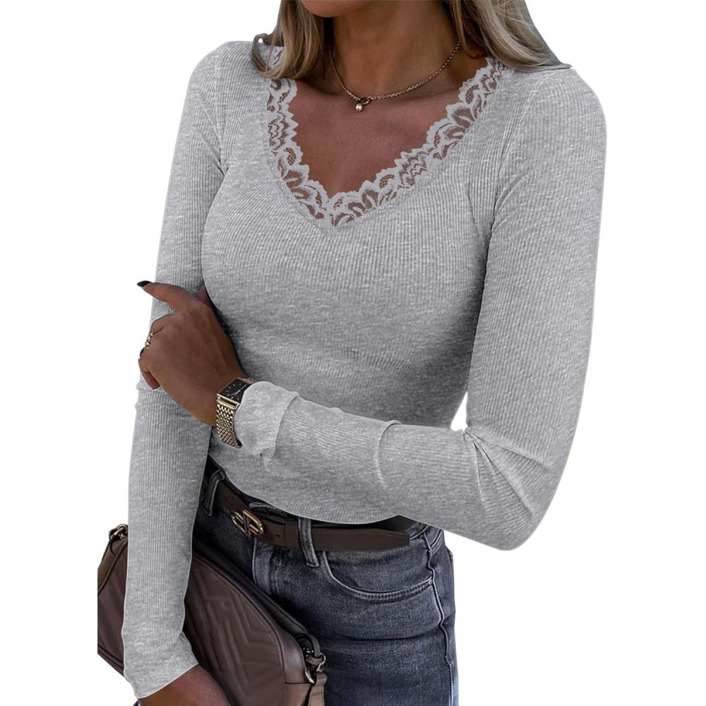 Long Sleeve Shirts for Women Lace V Neck Ribbed Fitted T-Shirt Dressy Business Casual Blouses 2025 Trendy Fall Tops(Grey)