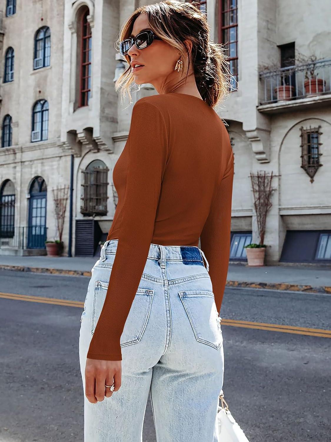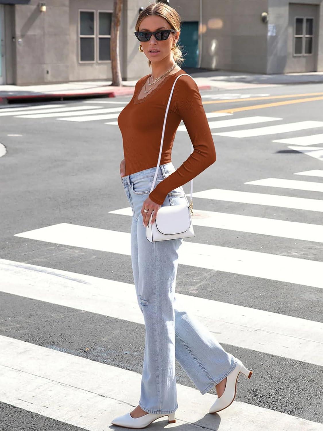 Long Sleeve Shirts for Women Lace V Neck Ribbed Fitted T-Shirt Dressy Business Casual Blouses 2025 Trendy Fall Tops(Orange)