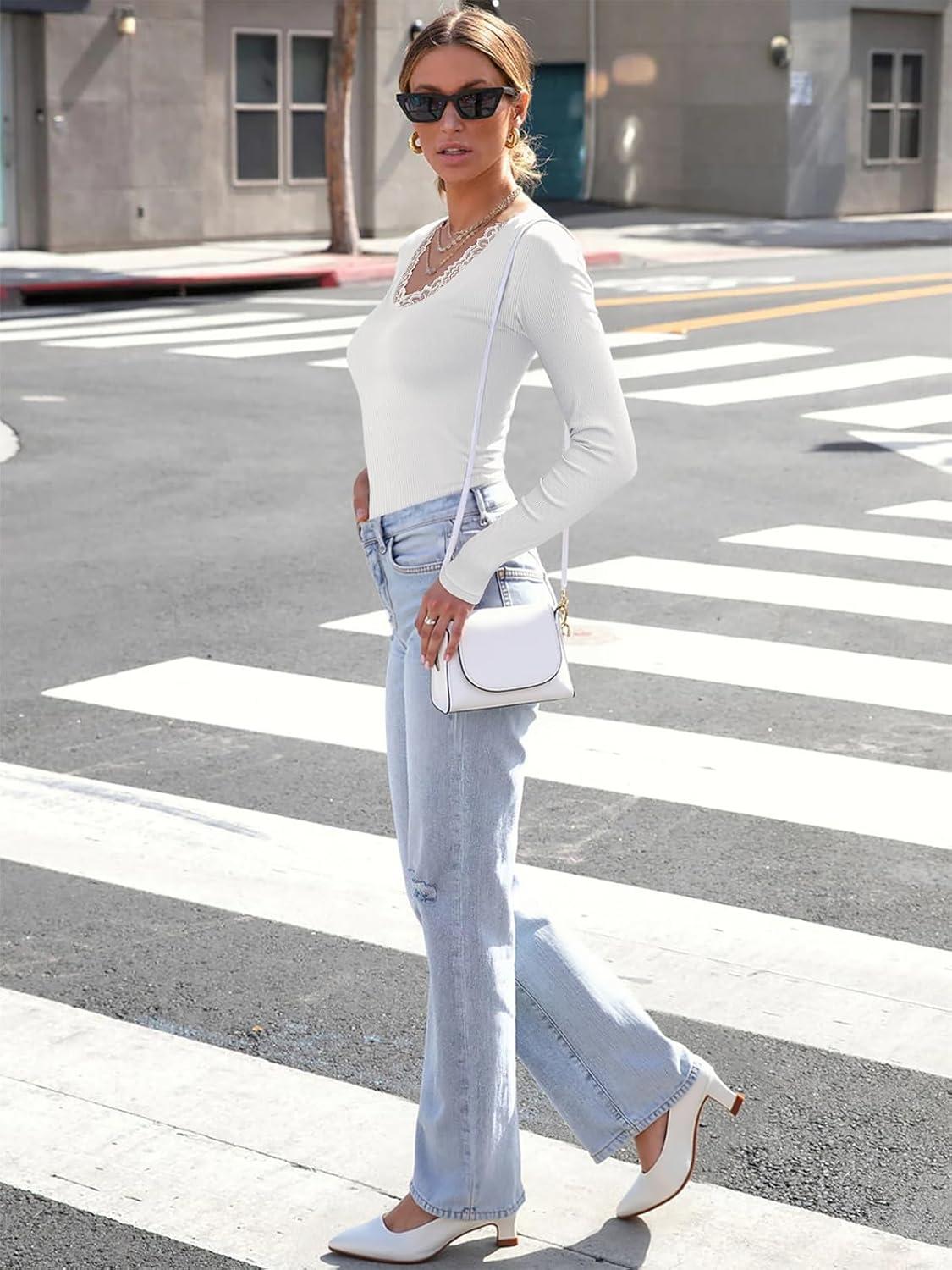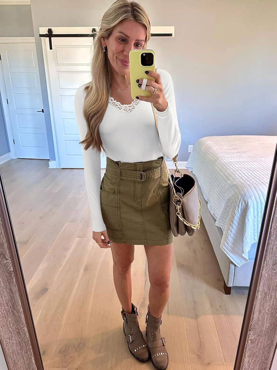 Long Sleeve Shirts for Women Lace V Neck Ribbed Fitted T-Shirt Dressy Business Casual Blouses 2025 Trendy Fall Tops(White)