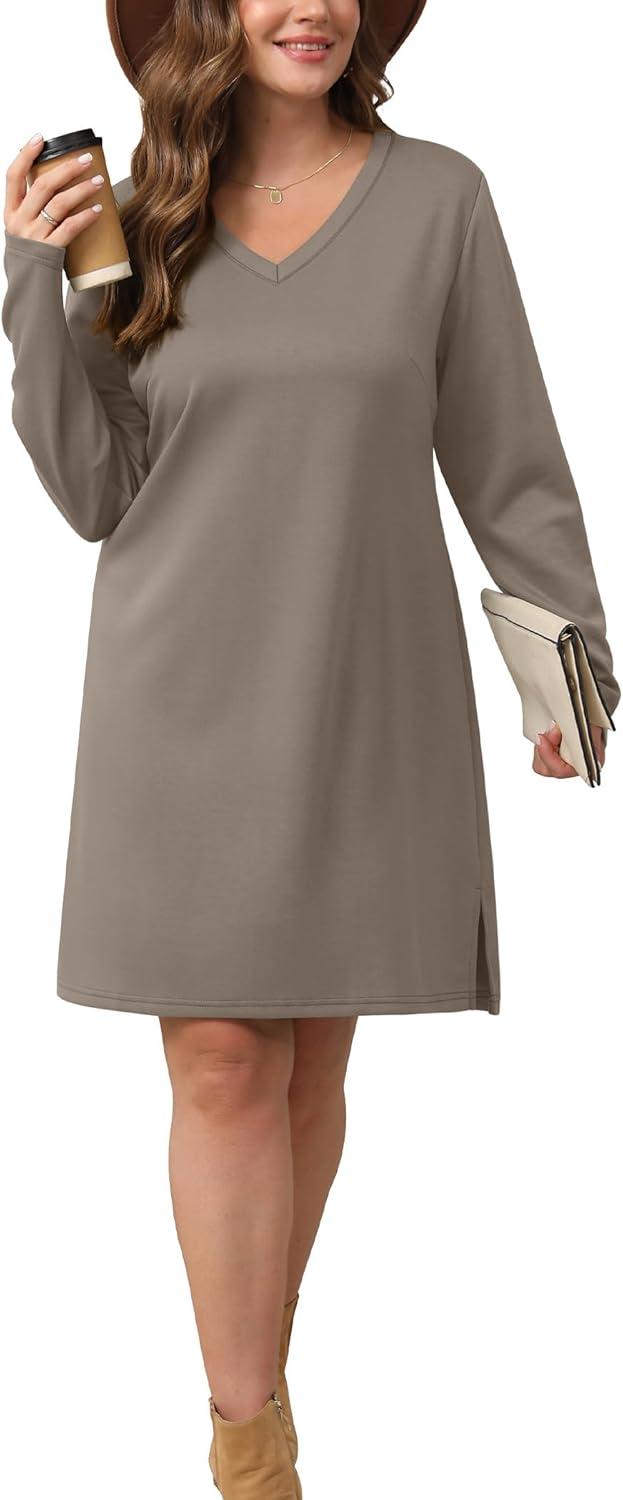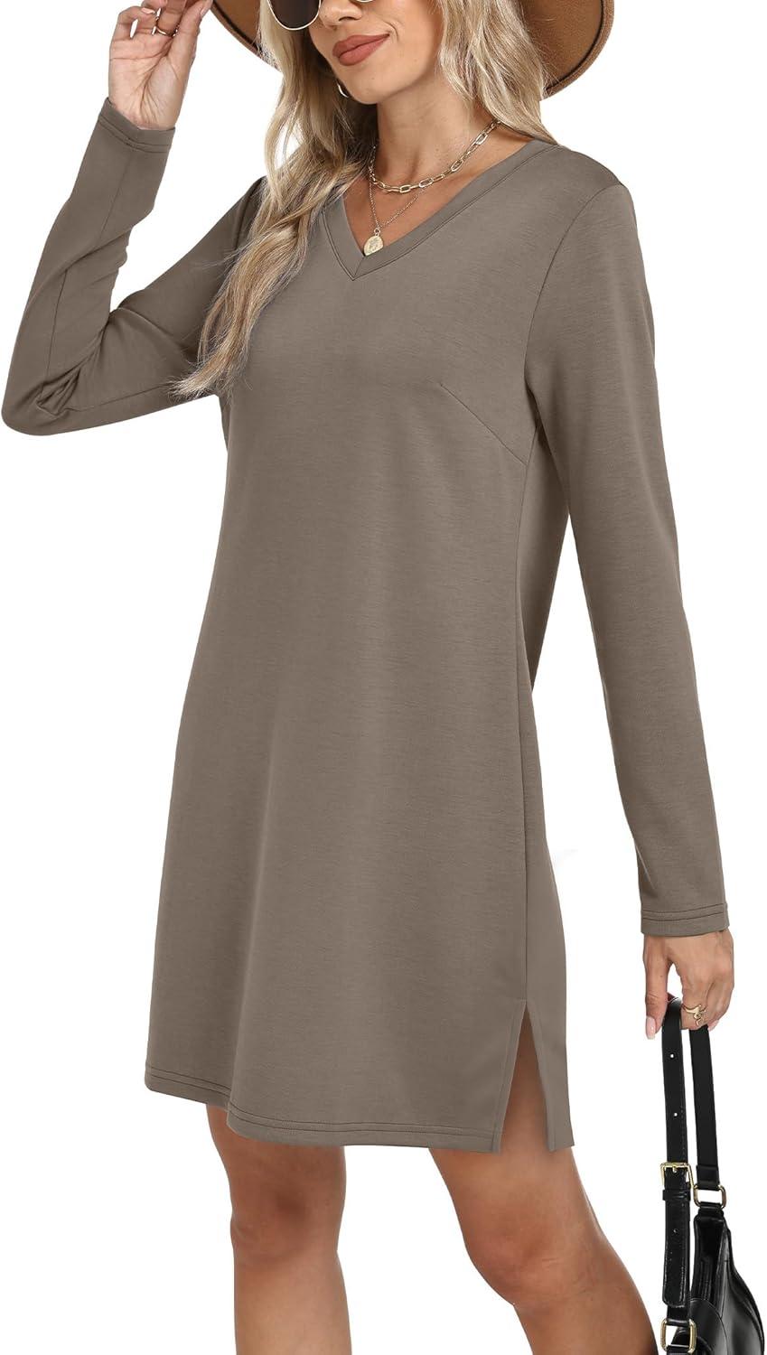 Sampeel Dresses for Women 2025 Casual Long Sleeve V Neck Tshirt Dress Side Split Fashion Fall Outfits(Coffee)