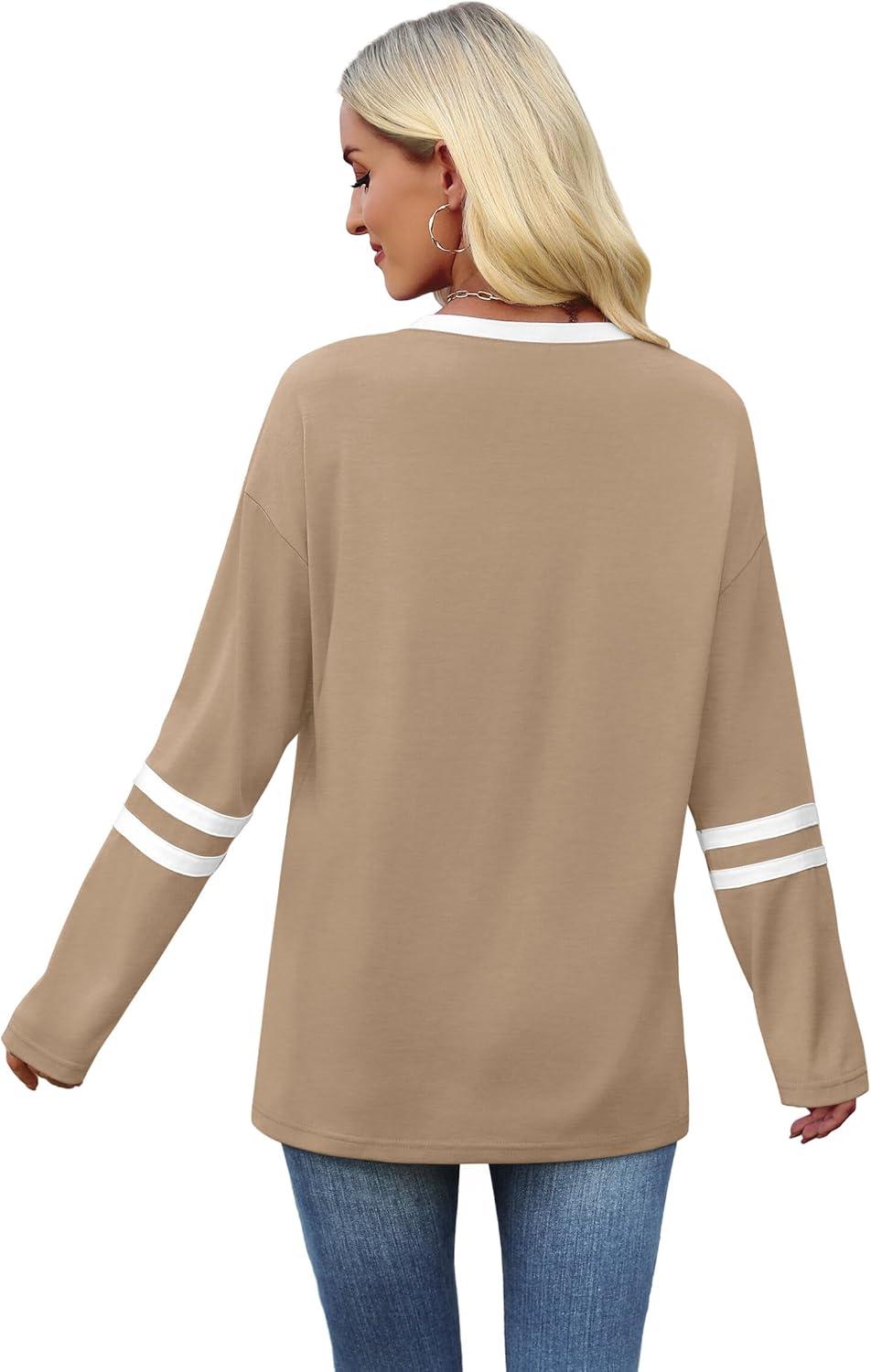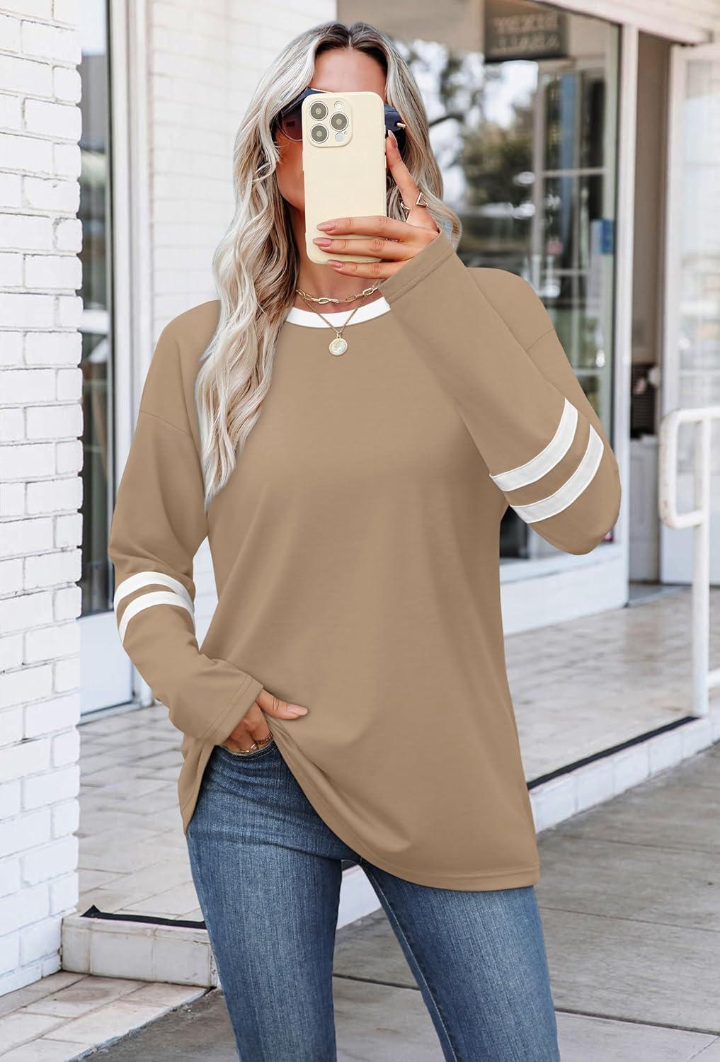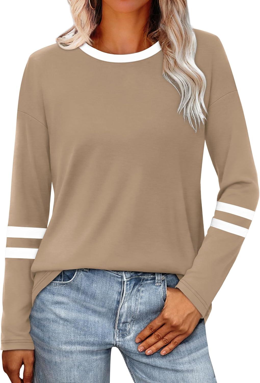 Sampeel Long Sleeve Shirts for Women Color Block Casual Tops Fall Outfits 2025 Basic Tees Trendy Clothes(05 Khaki)