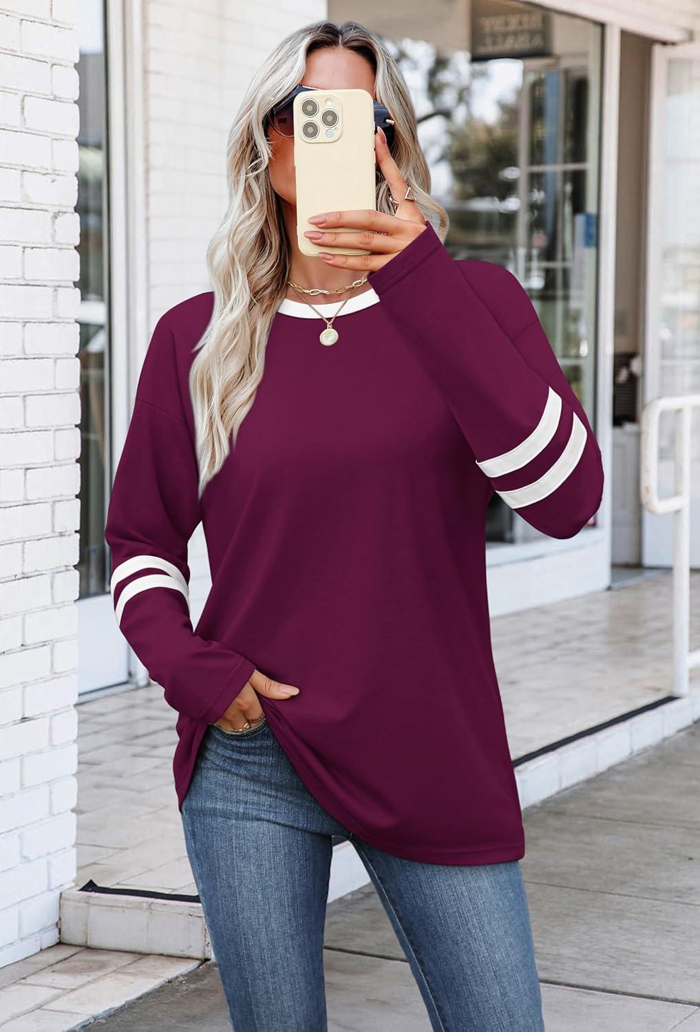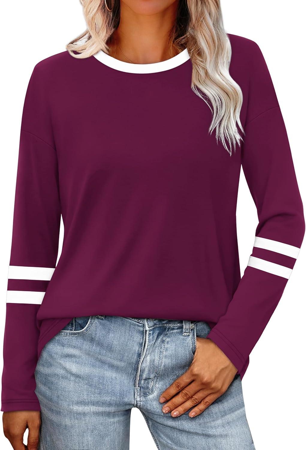 Sampeel Long Sleeve Shirts for Women Color Block Casual Tops Fall Outfits 2025 Basic Tees Trendy Clothes(11 Purple Red)