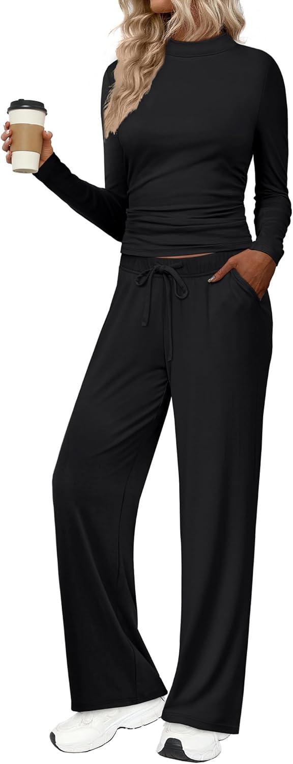 Sampeel Two Piece Lounge Set for Women 2 Piece Fall Outfits 2025 Mock Neck Ruched Tops Wide Leg Pants Travel Airport(Black (Long))