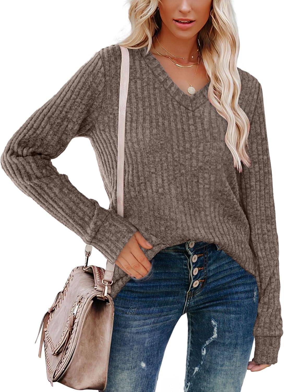 Sampeel V Neck Long Sleeve Shirts for Women Casual Fall Tops Lightweight Tunic Sweaters Fashion Clothes Loose Fit 2025(Coffee)