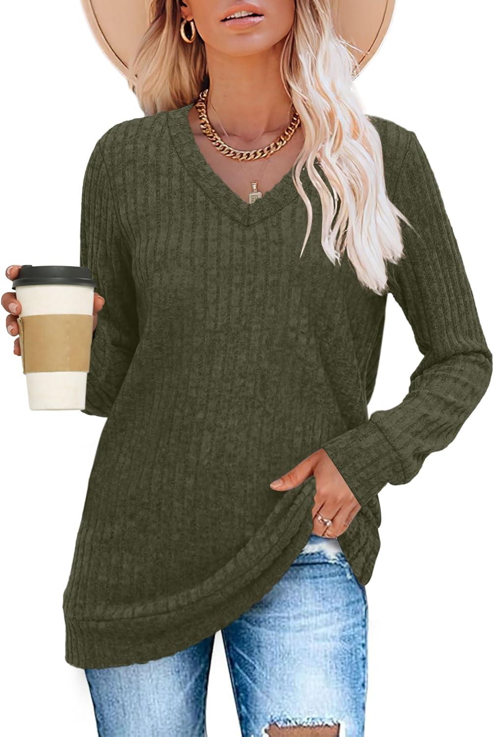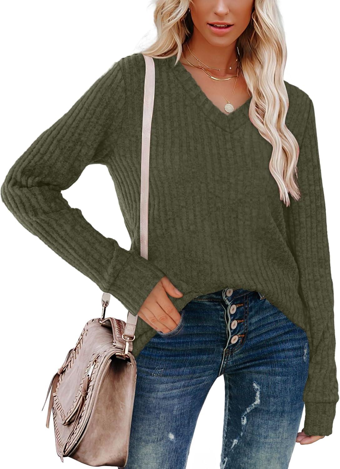 Sampeel V Neck Long Sleeve Shirts for Women Casual Fall Tops Lightweight Tunic Sweaters Fashion Clothes Loose Fit 2025(Pretty Arm Green)