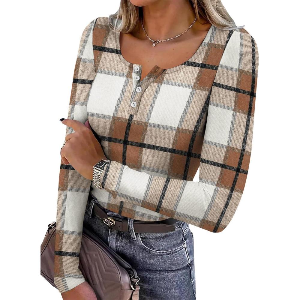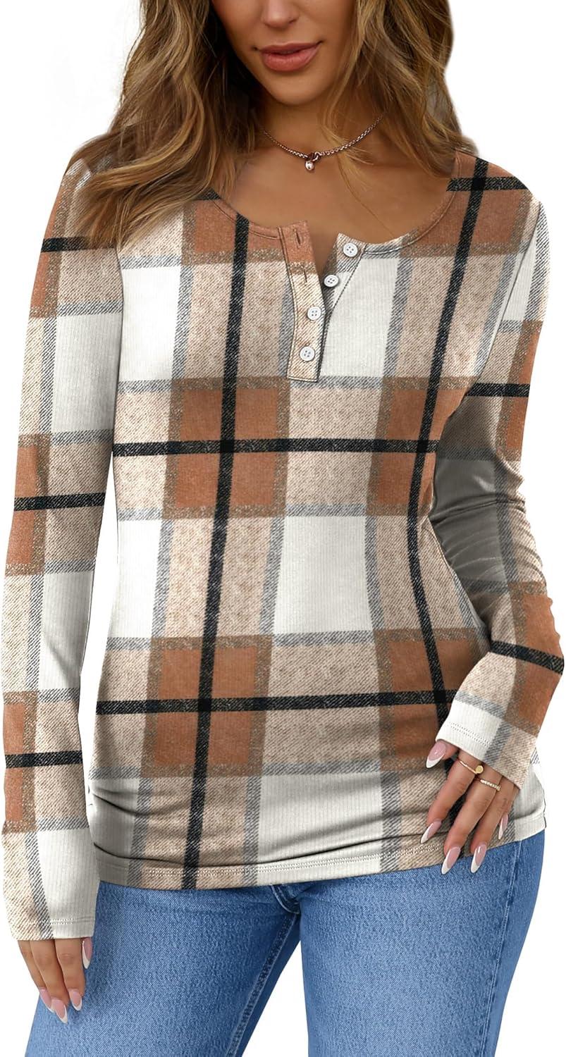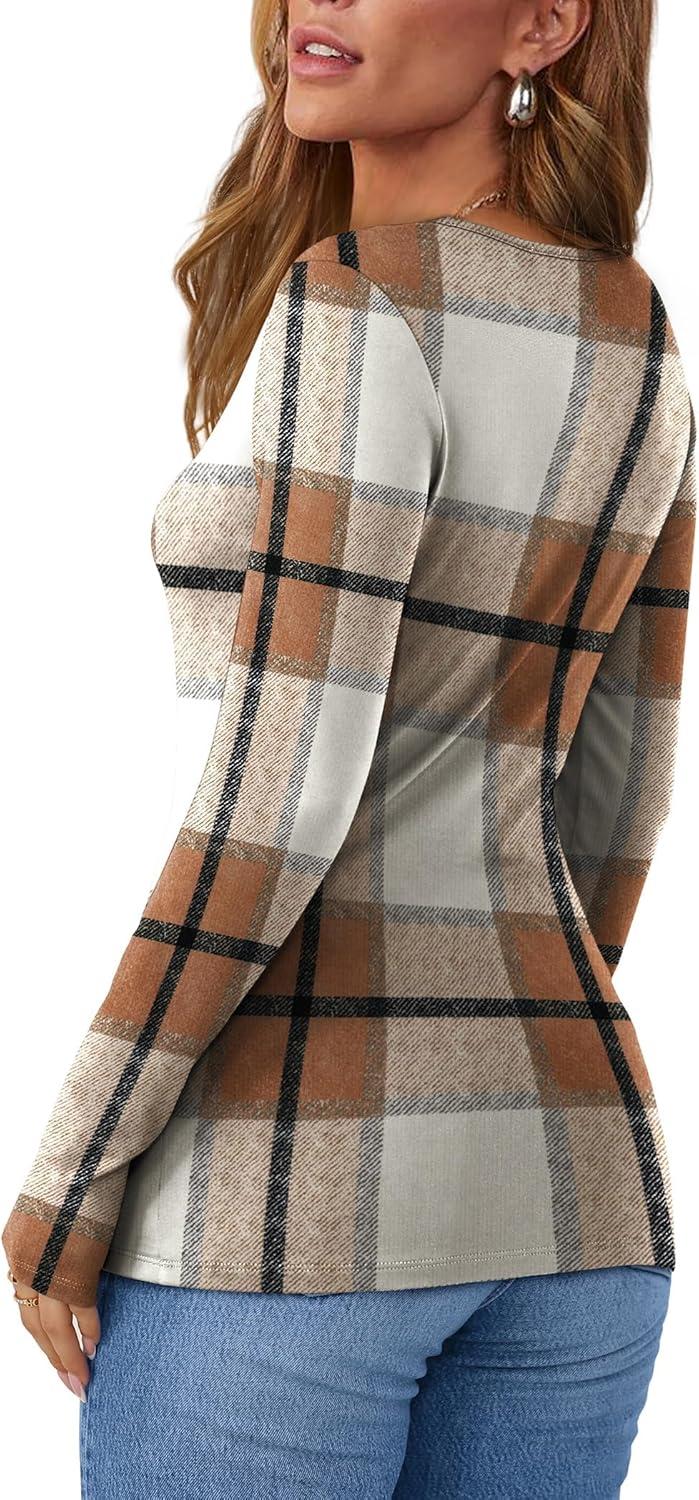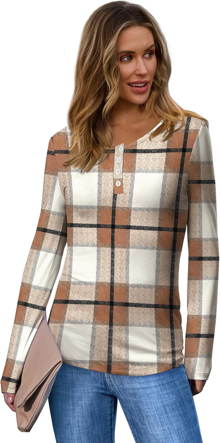 SAMPEEL Womens Long Sleeve Henley Shirts Slim Fit Tops 2025 Casual Fashion Outfits Basic Trendy T-Shirts Soft Clothing(Pattern-plaid)