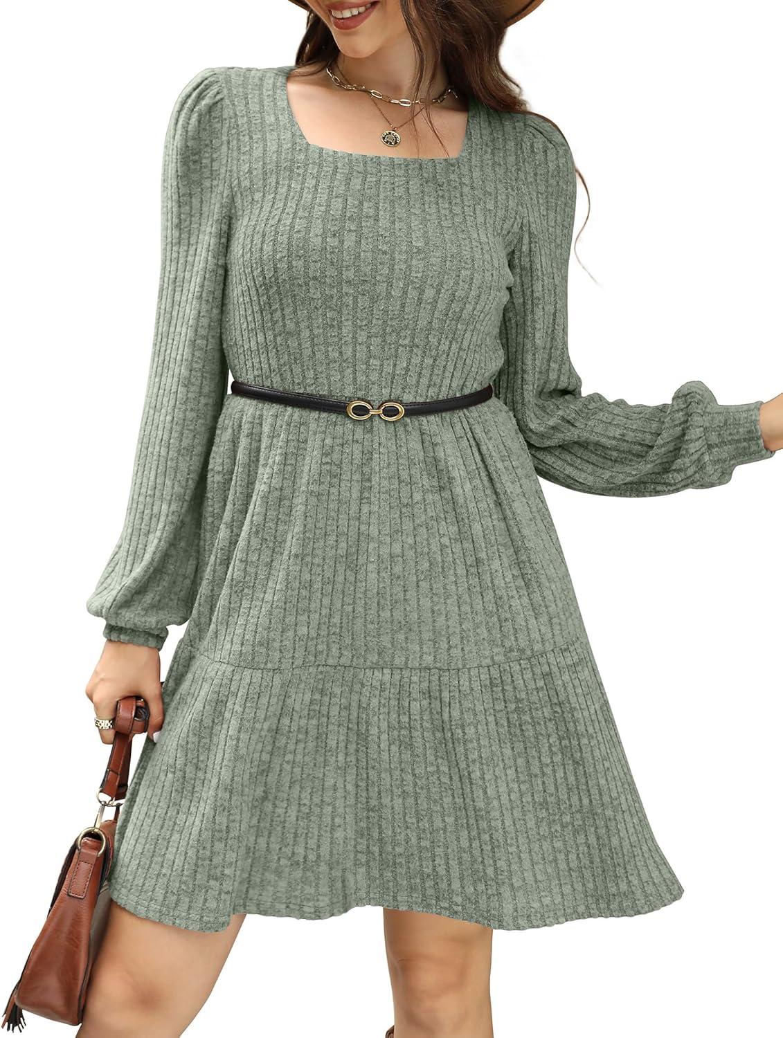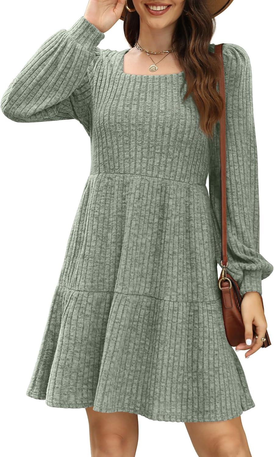 Sampeel Womens Square Neck Long Sleeve Fall Dresses Casual Babydoll Sweater Dress(Cream Green)