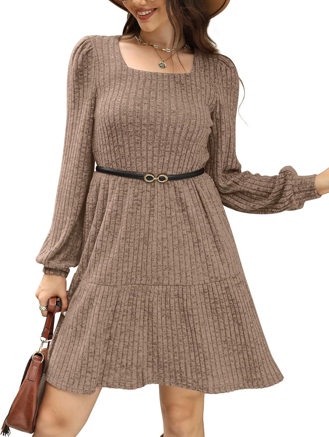 Sampeel Womens Square Neck Long Sleeve Fall Dresses Casual Babydoll Sweater Dress(Khaki)