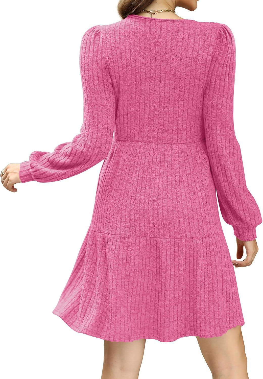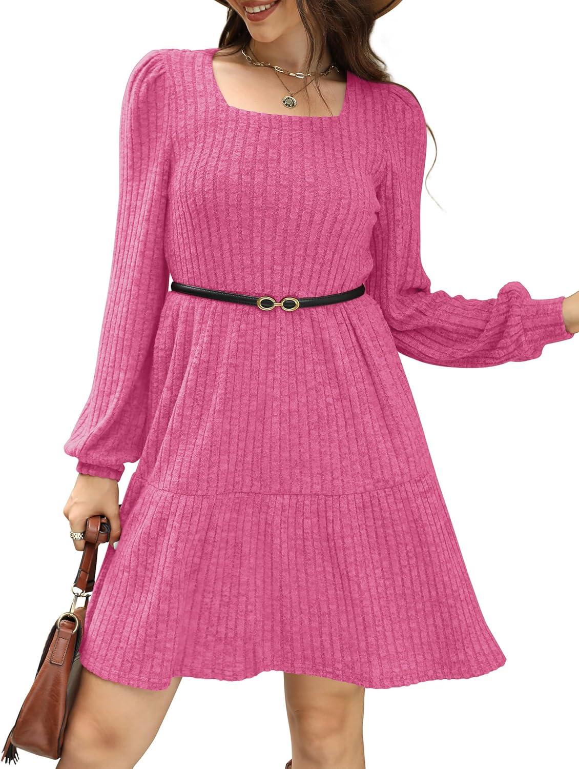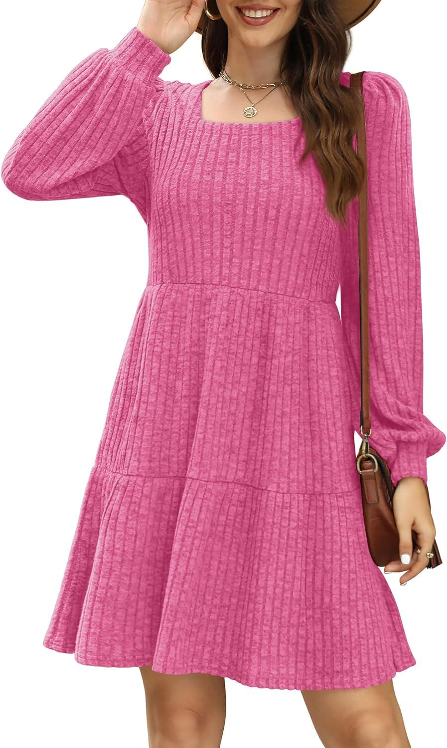 Sampeel Womens Square Neck Long Sleeve Fall Dresses Casual Babydoll Sweater Dress(Pink)