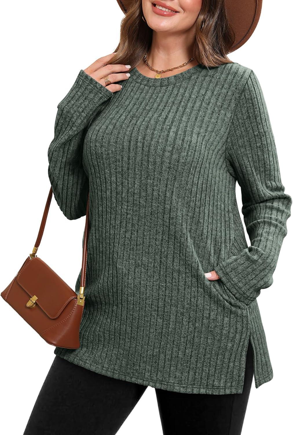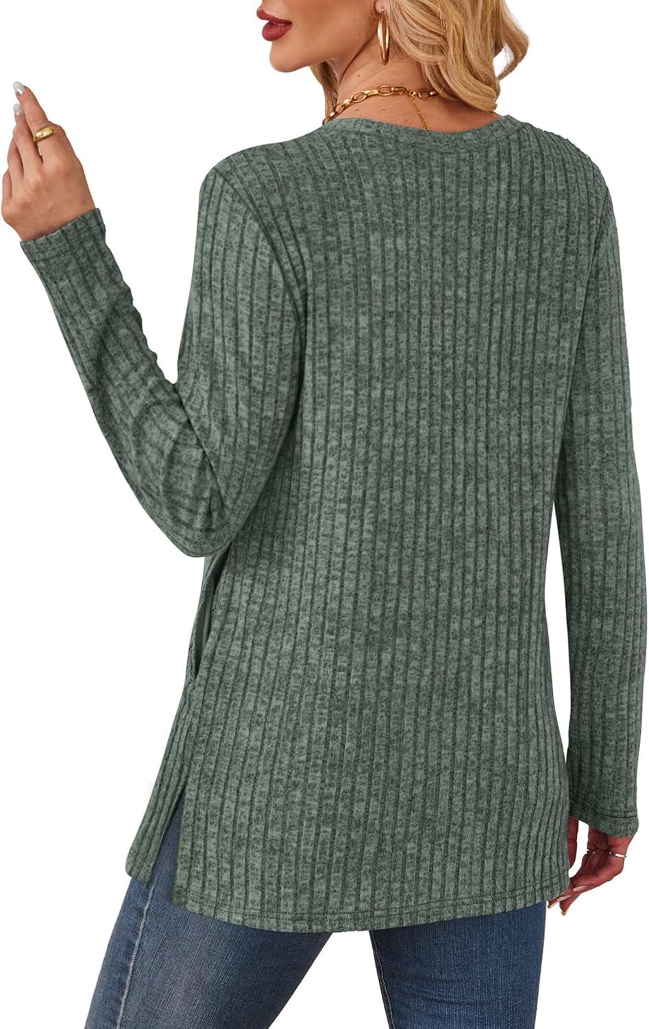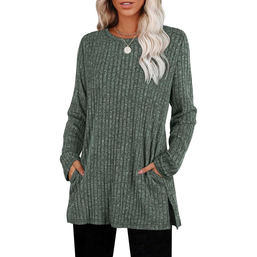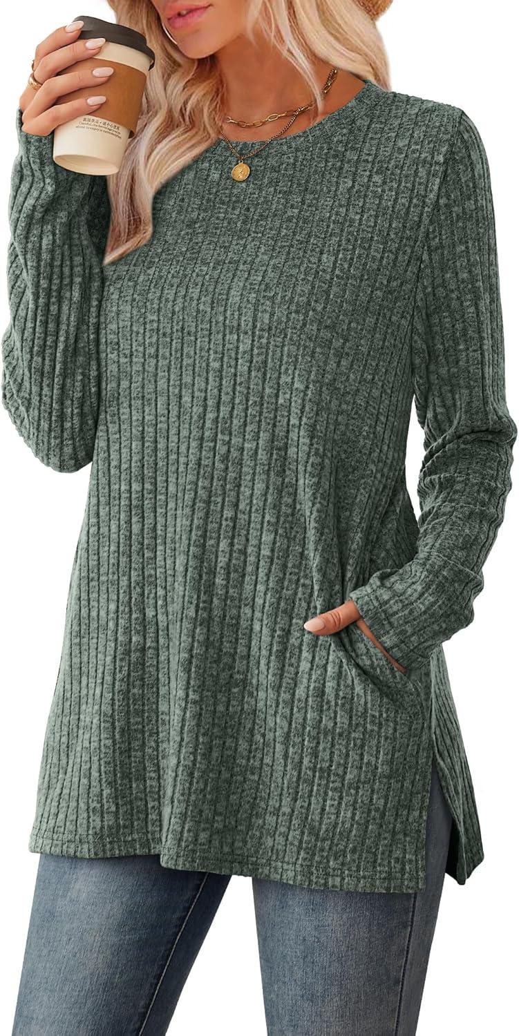 SAMPEEL Womens Sweaters Crewneck Long Sleeve Shirts with Pockets Fall Outfits 2025 Fashion Winter Clothing Side Slit(Classic Green)