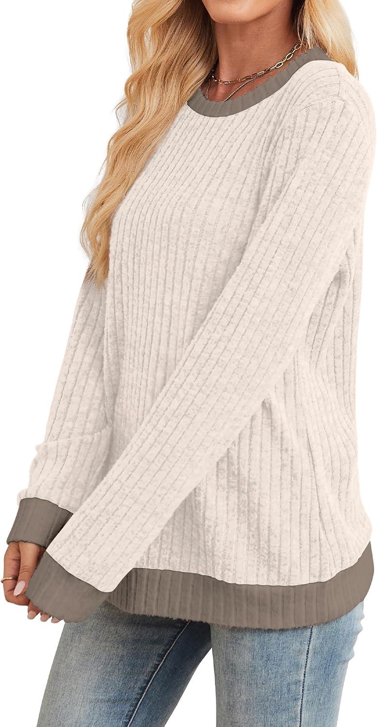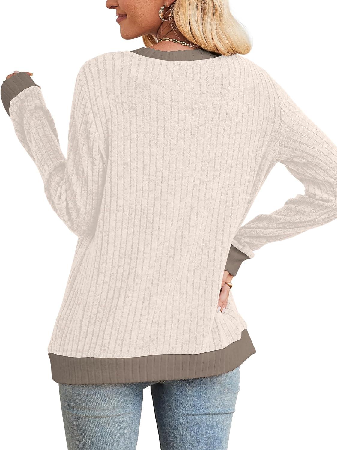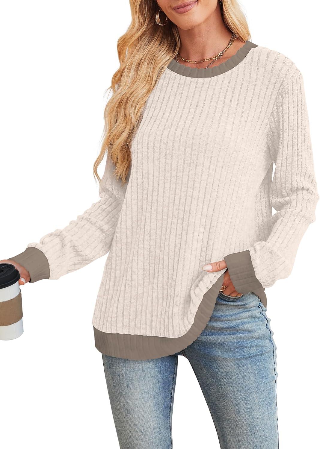 Sampeel Womens Tops Long Sleeve Shirts Lightweight Sweaters Loose Fit Crewneck Color Block Fall Fashion Outfits(Apricot)