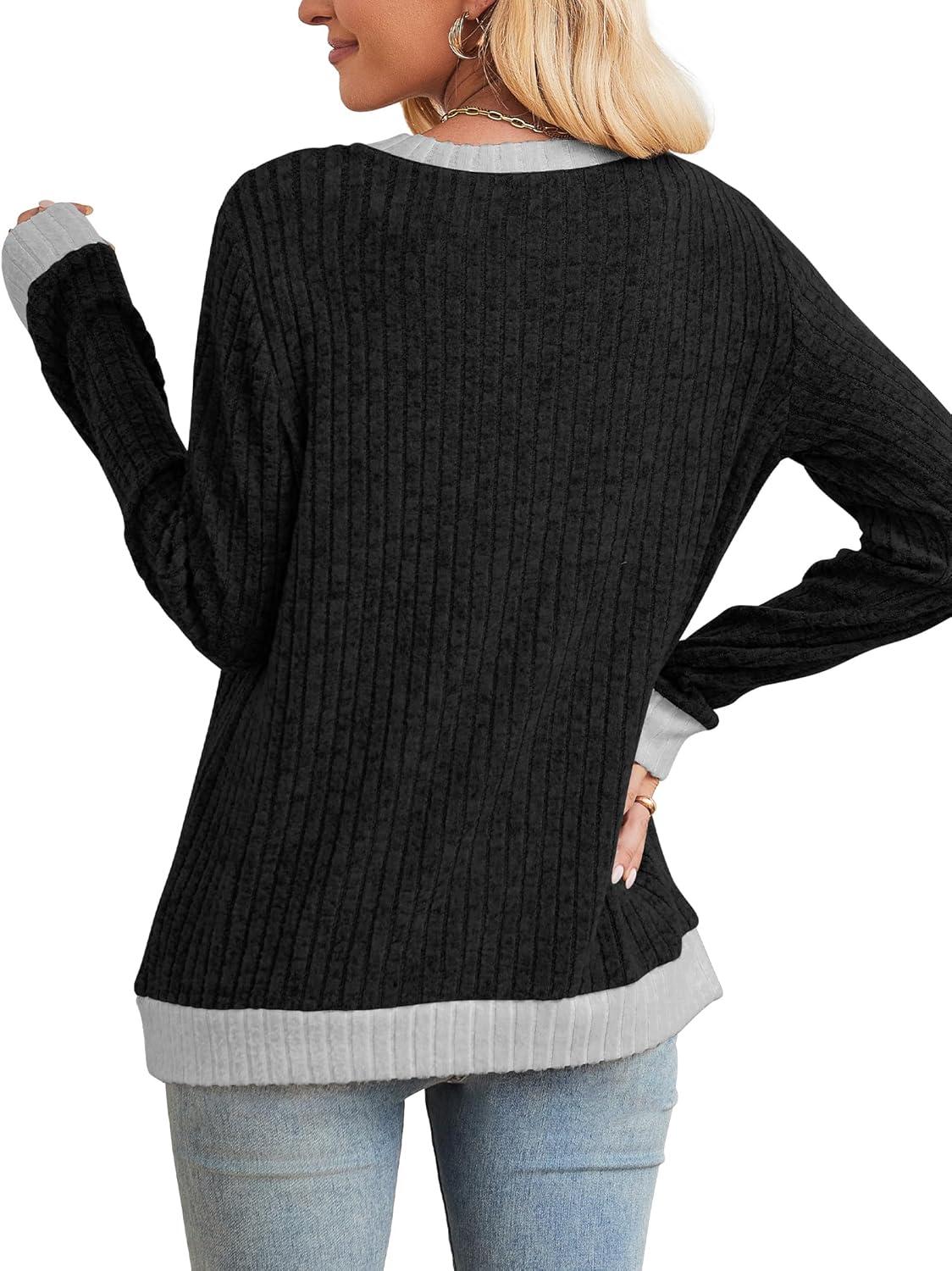 Sampeel Womens Tops Long Sleeve Shirts Lightweight Sweaters Loose Fit Crewneck Color Block Fall Fashion Outfits(Black)