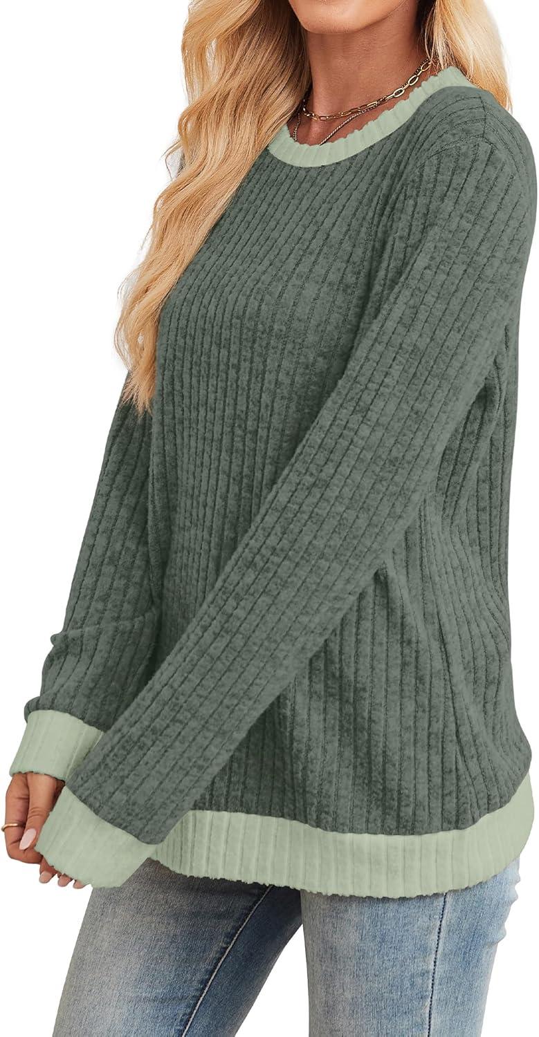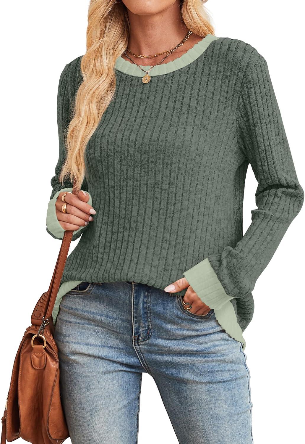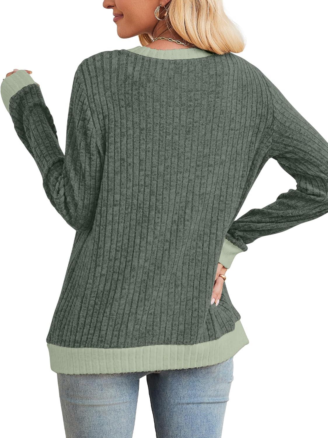 Sampeel Womens Tops Long Sleeve Shirts Lightweight Sweaters Loose Fit Crewneck Color Block Fall Fashion Outfits(Classic Green)