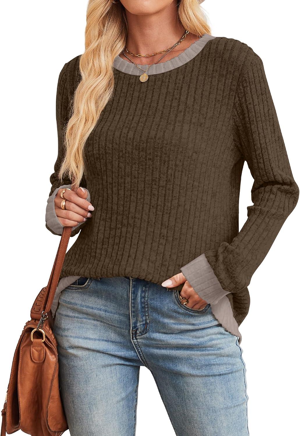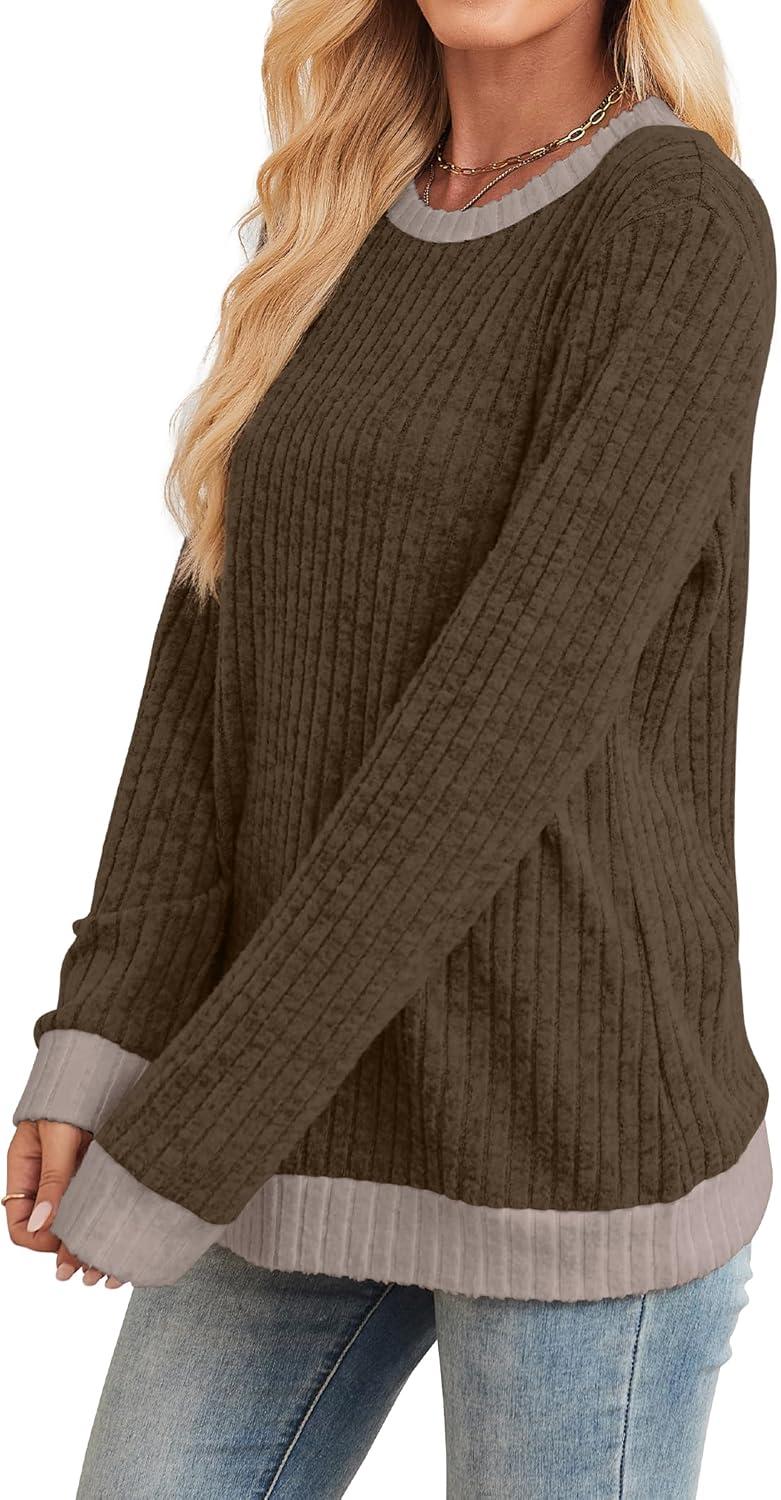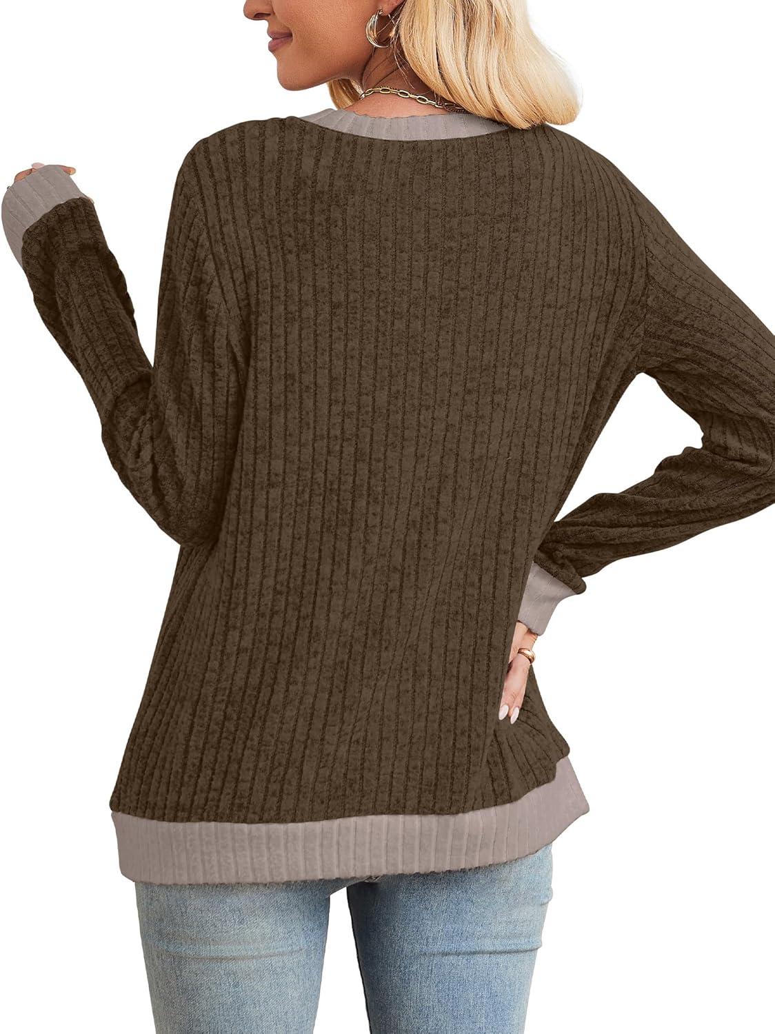 Sampeel Womens Tops Long Sleeve Shirts Lightweight Sweaters Loose Fit Crewneck Color Block Fall Fashion Outfits(Dark Brown)