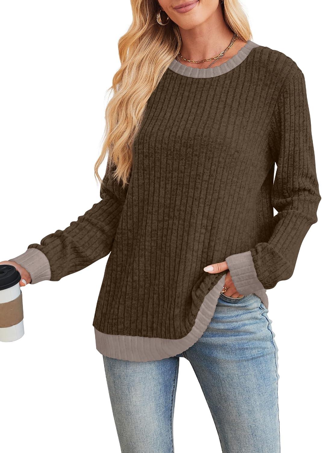 Sampeel Womens Tops Long Sleeve Shirts Lightweight Sweaters Loose Fit Crewneck Color Block Fall Fashion Outfits(Coffee)