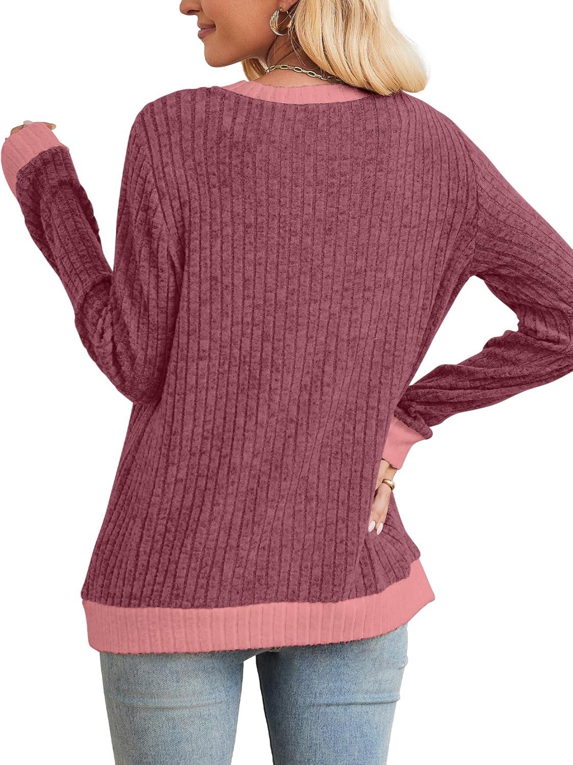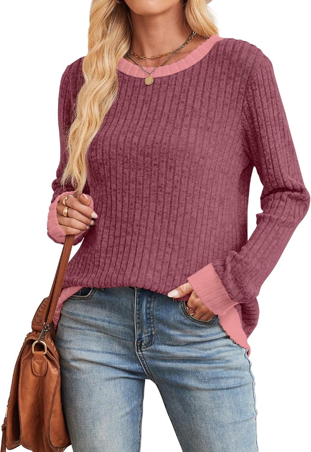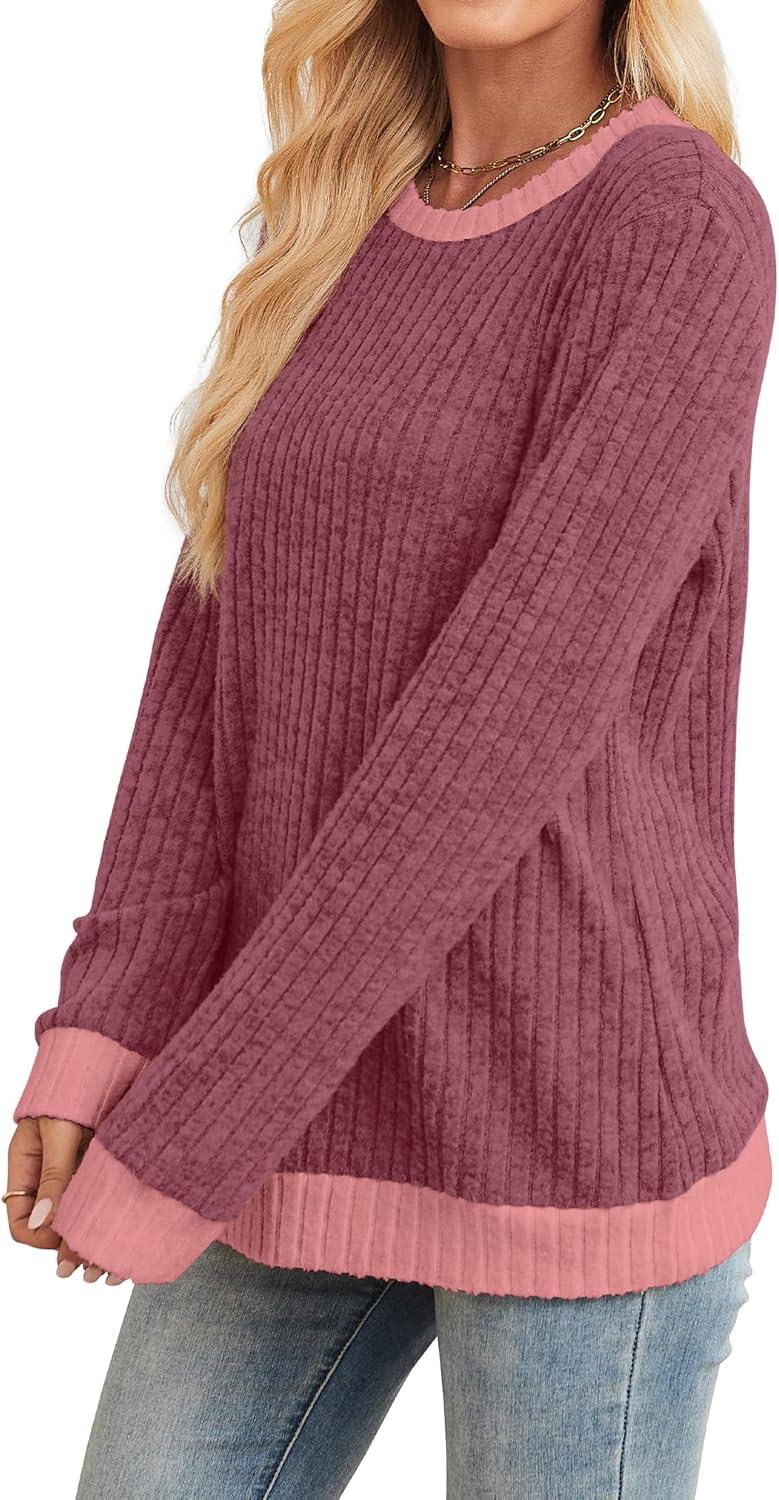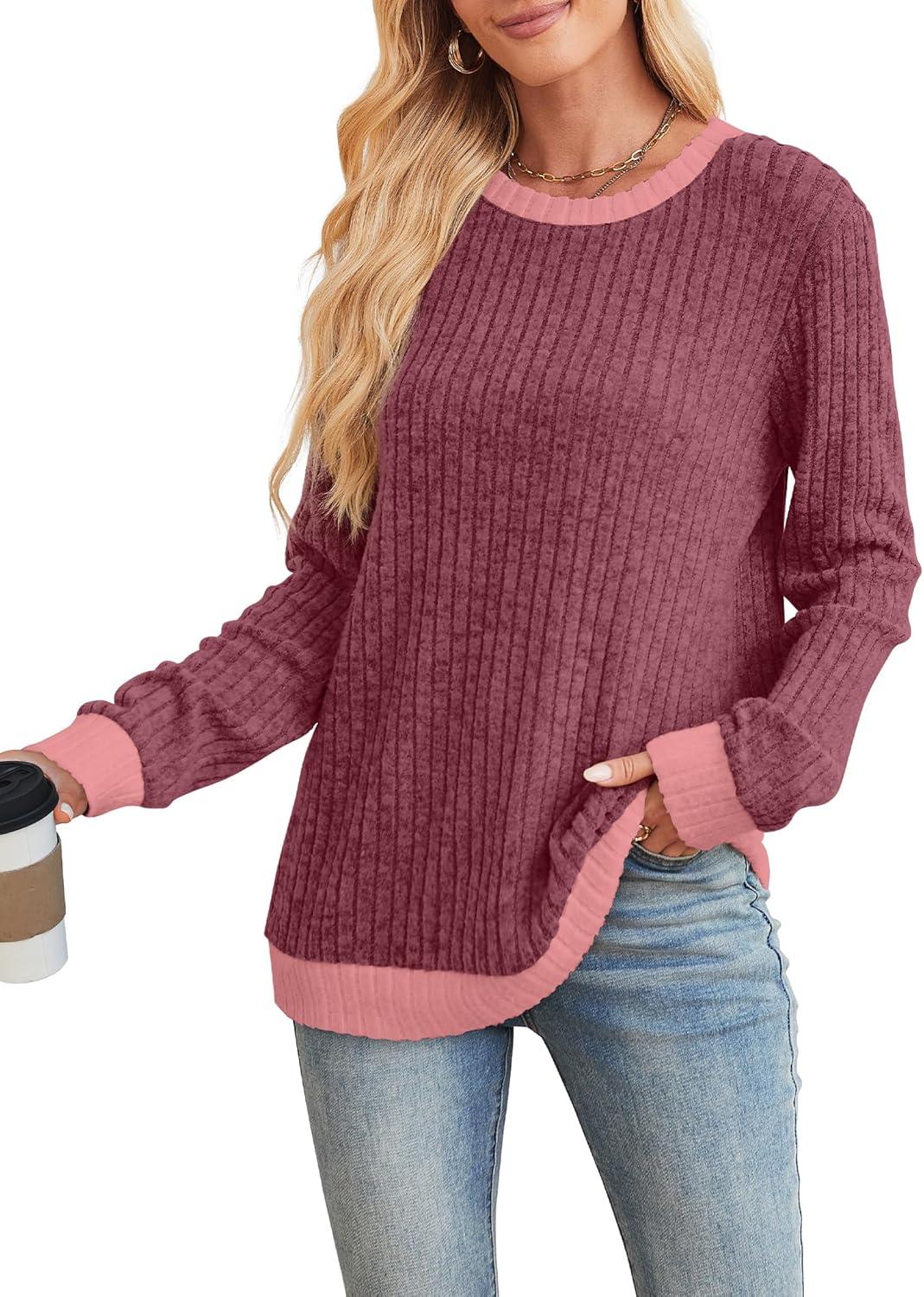 Sampeel Womens Tops Long Sleeve Shirts Lightweight Sweaters Loose Fit Crewneck Color Block Fall Fashion Outfits(Fuchsia)