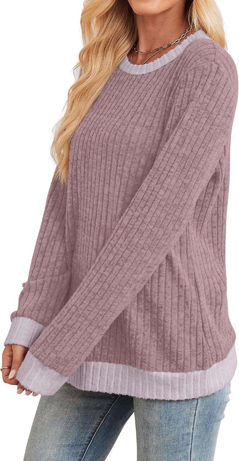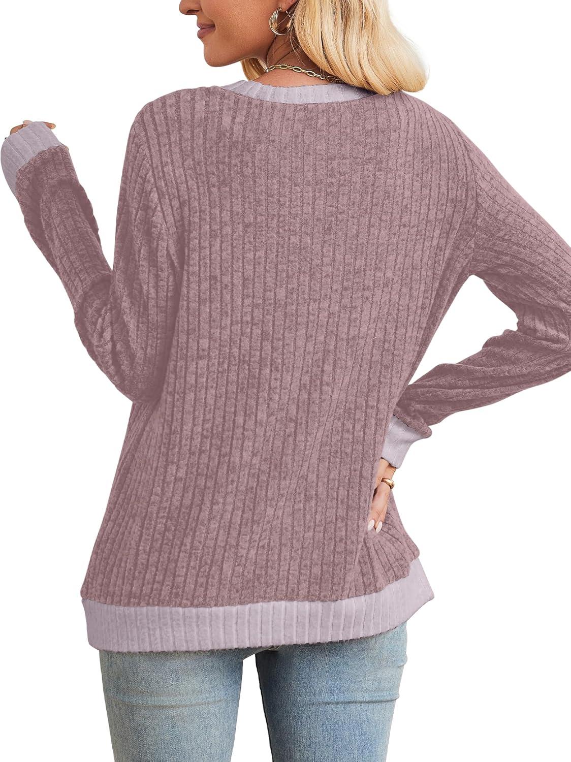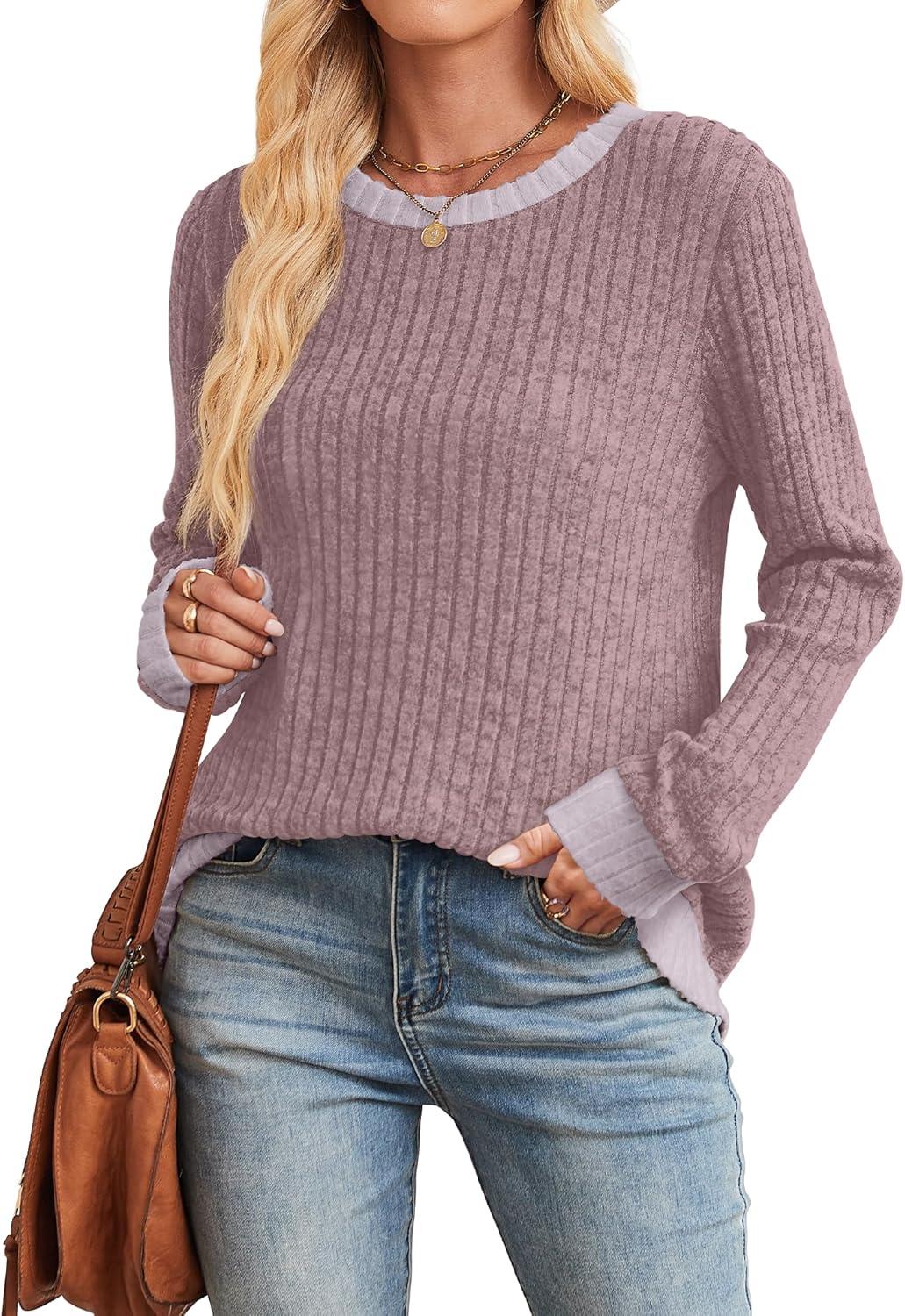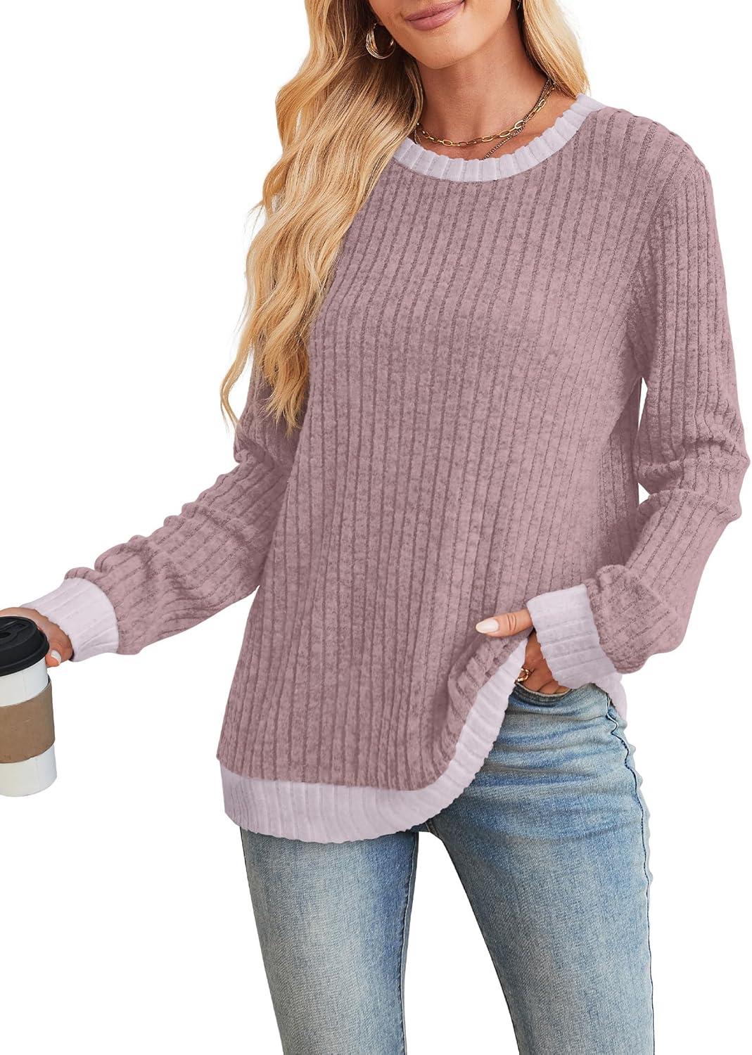 Sampeel Womens Tops Long Sleeve Shirts Lightweight Sweaters Loose Fit Crewneck Color Block Fall Fashion Outfits(Grey Pink)