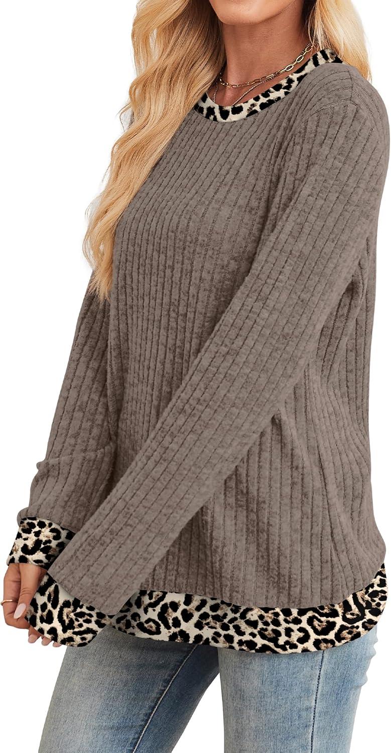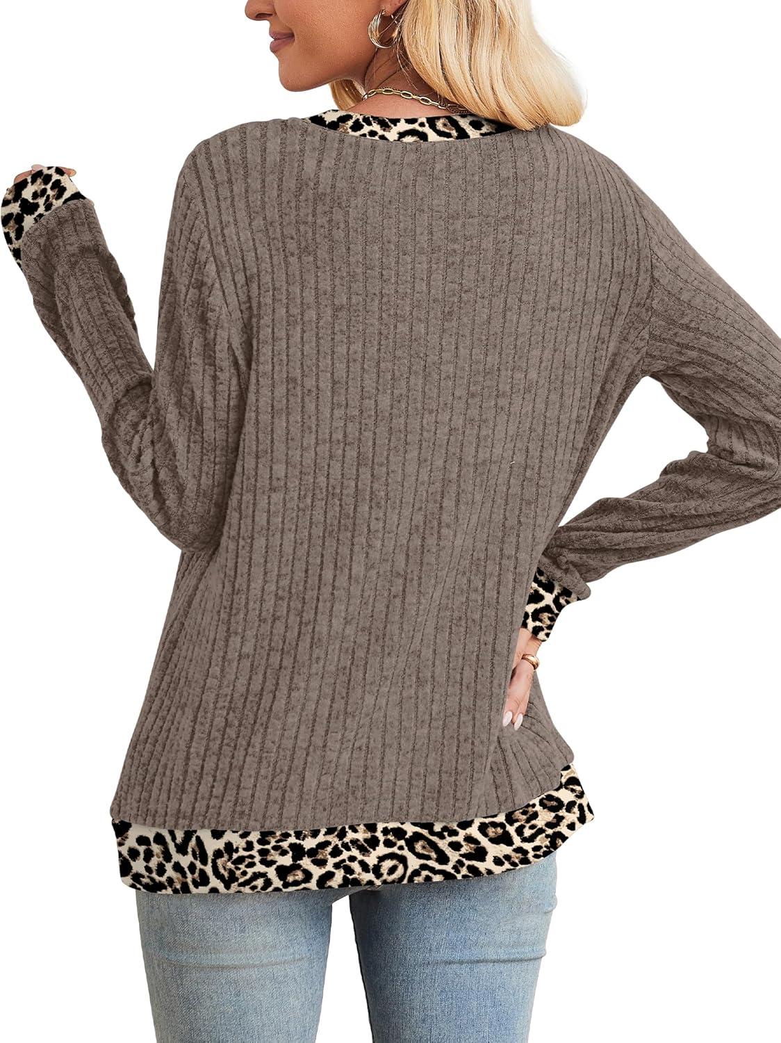 Sampeel Womens Tops Long Sleeve Shirts Lightweight Sweaters Loose Fit Crewneck Color Block Fall Fashion Outfits(Match Leopard)