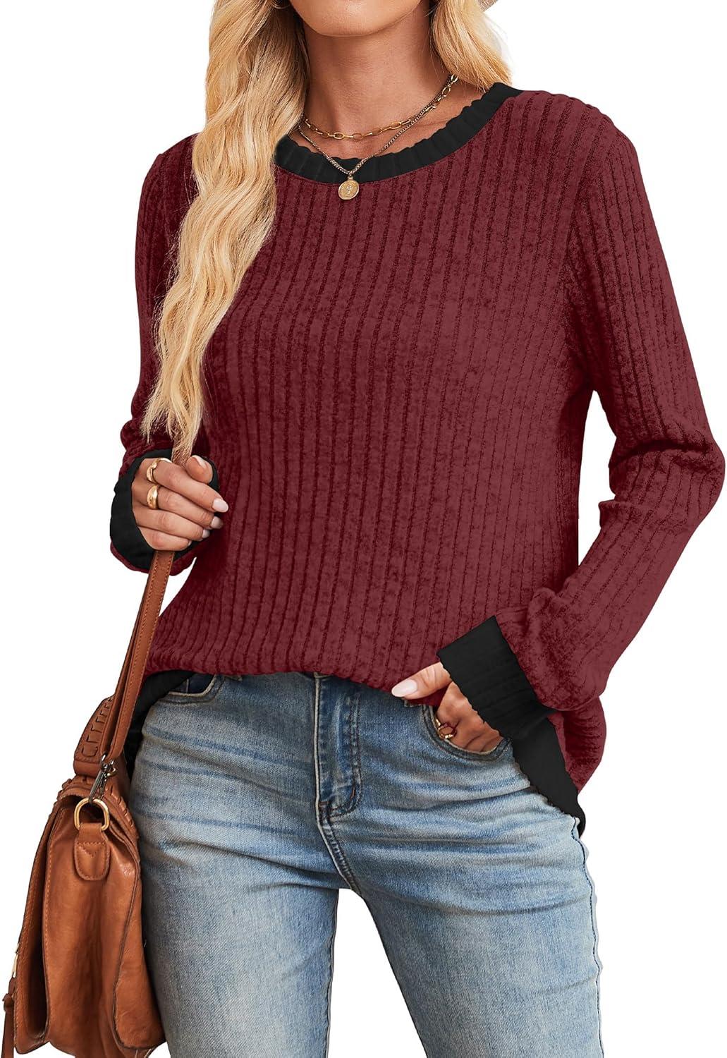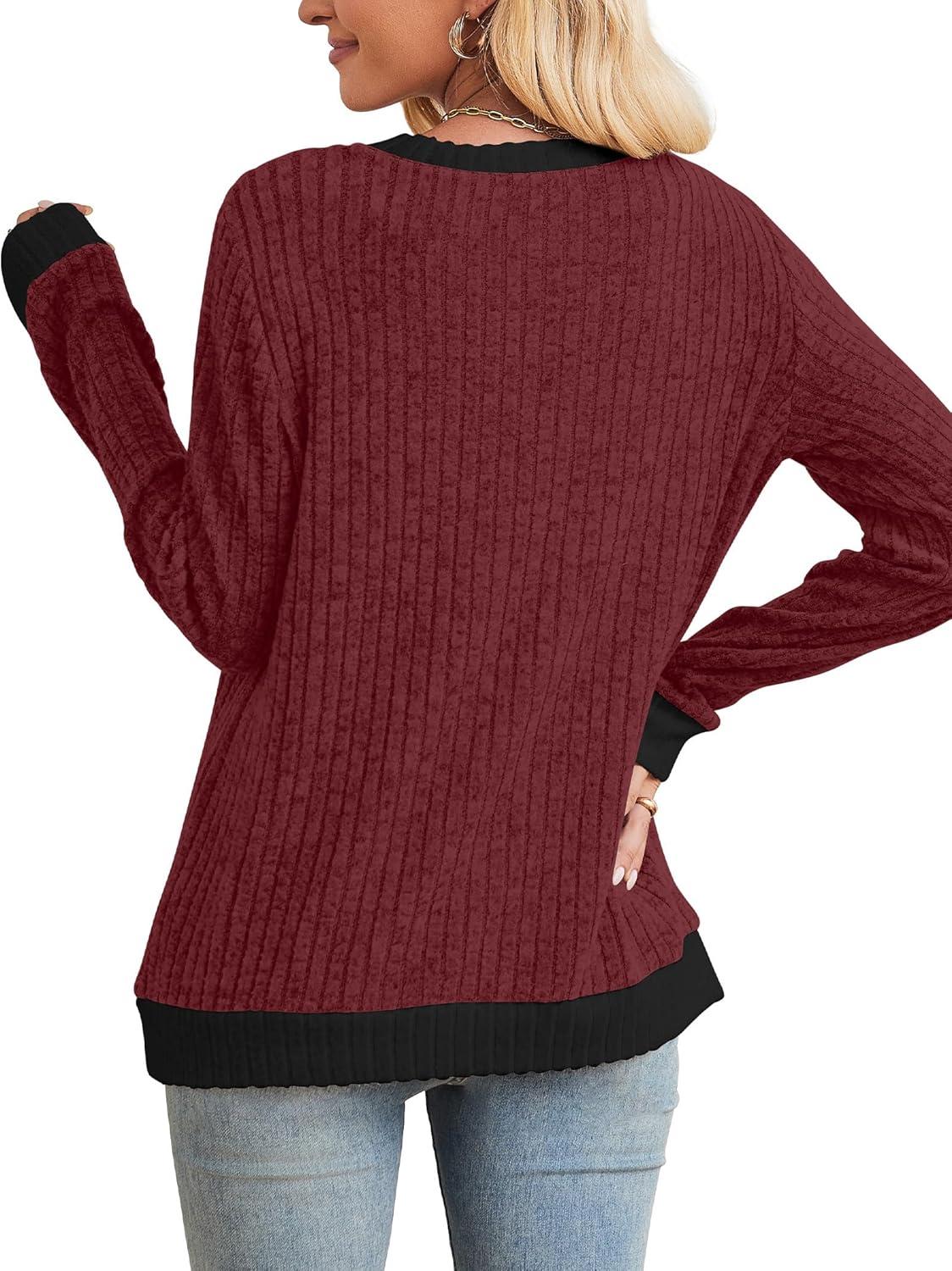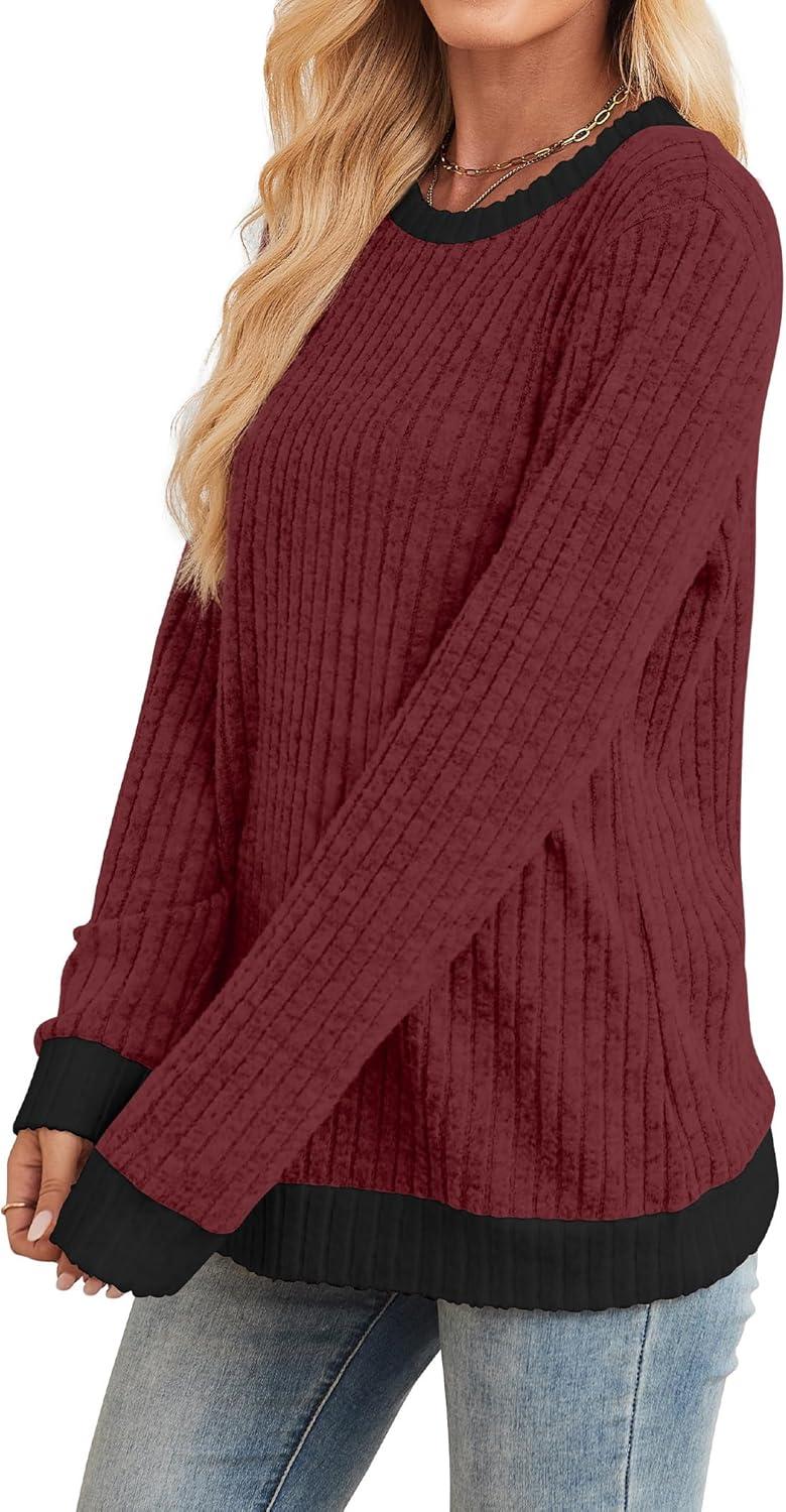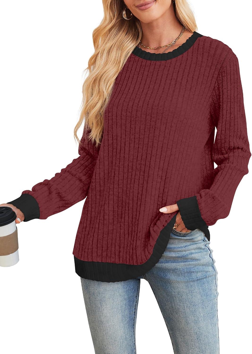 Sampeel Womens Tops Long Sleeve Shirts Lightweight Sweaters Loose Fit Crewneck Color Block Fall Fashion Outfits(Wine Red)