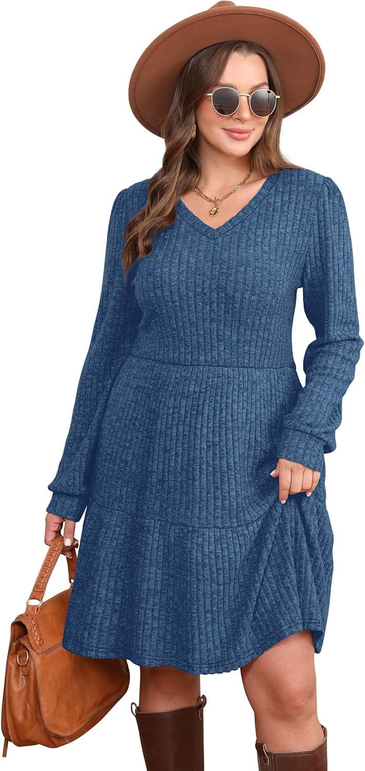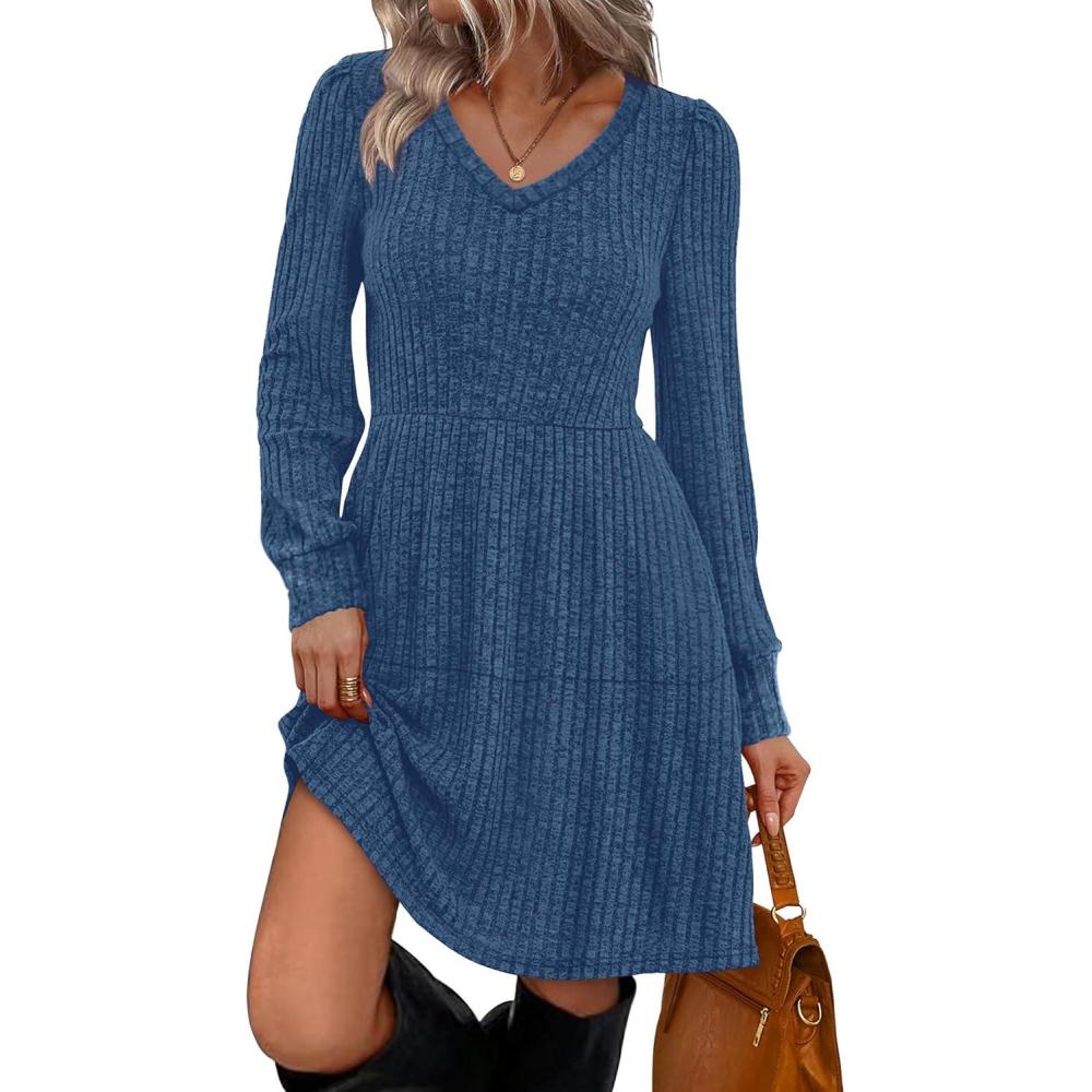 SAMPEEL Womens V Neck Long Sleeve Fall Dresses Baby Doll Casual Sweater Dress Fashion Clothes(Blue)