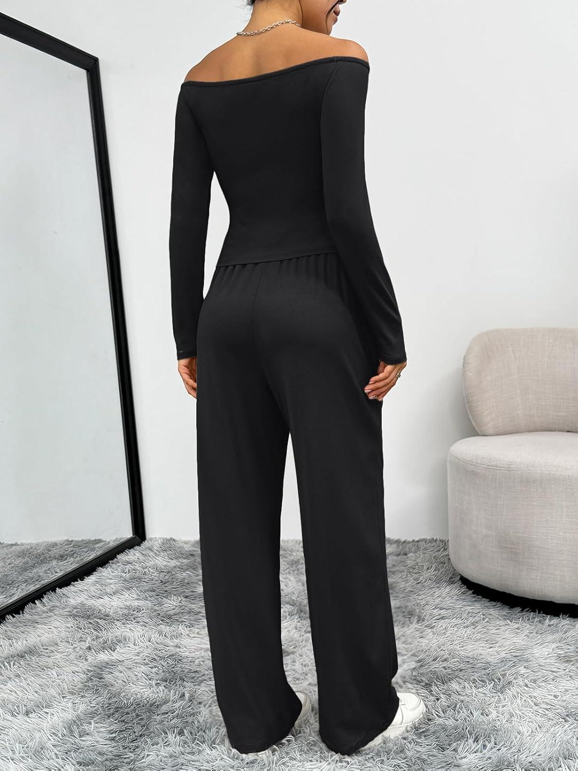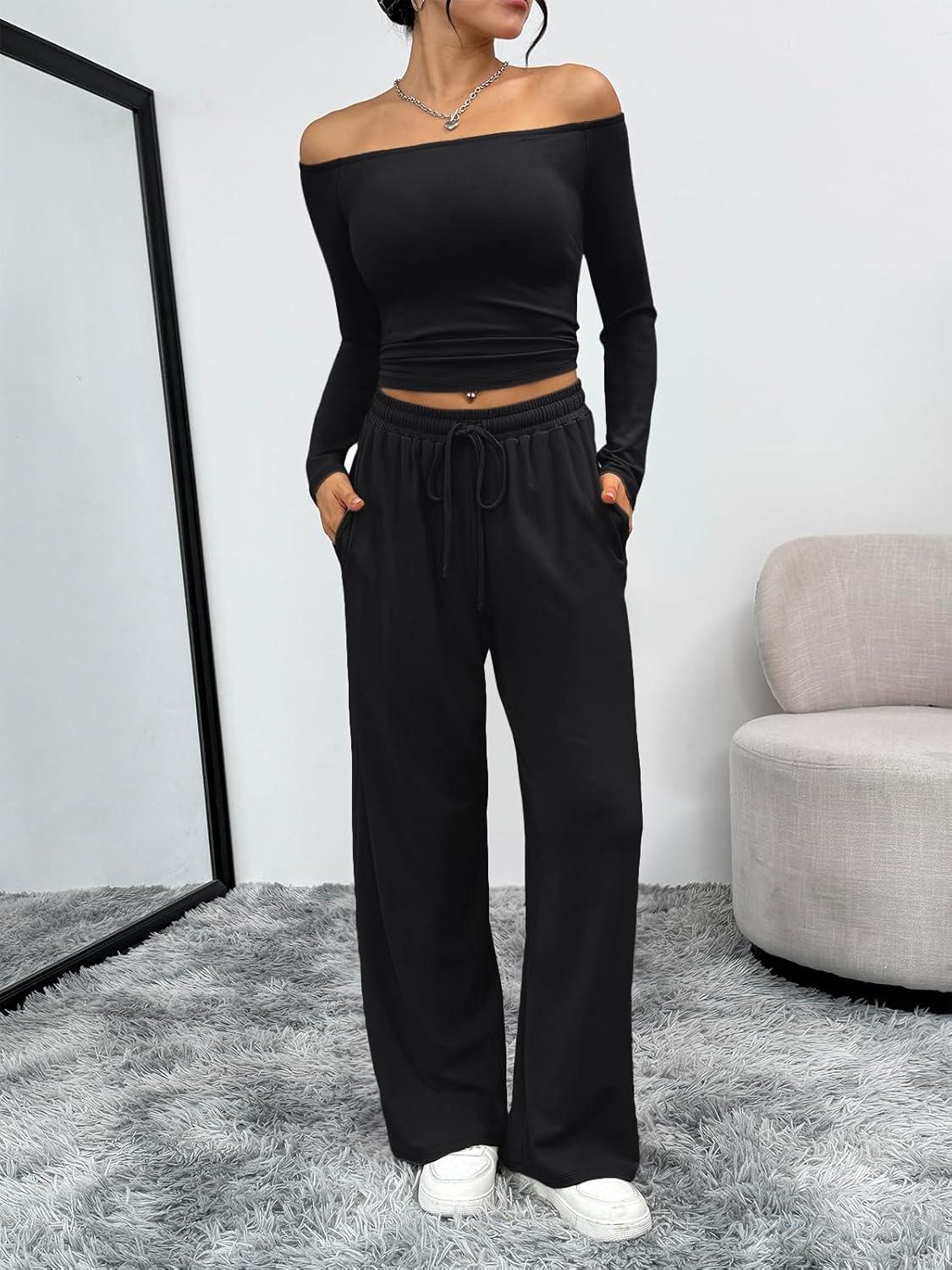Trendy Queen 2 Piece Off Shoulder Set Womens Wide Leg Pants Side Ruching Slightly Crop Top Sets(Black)
