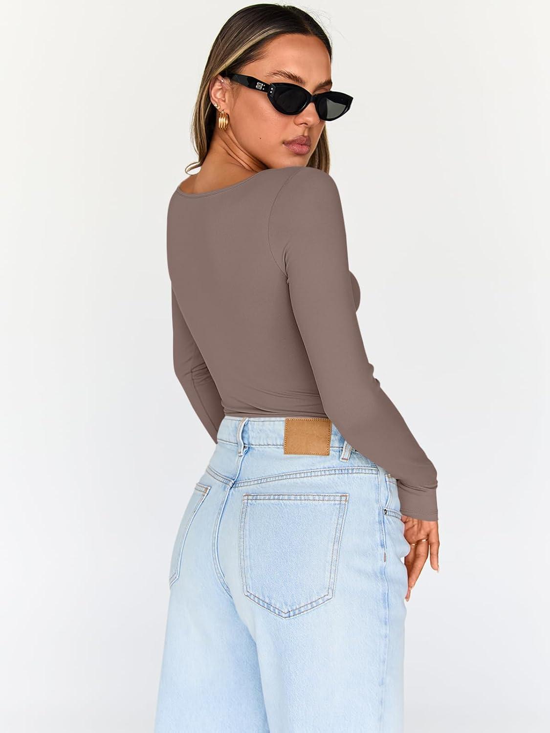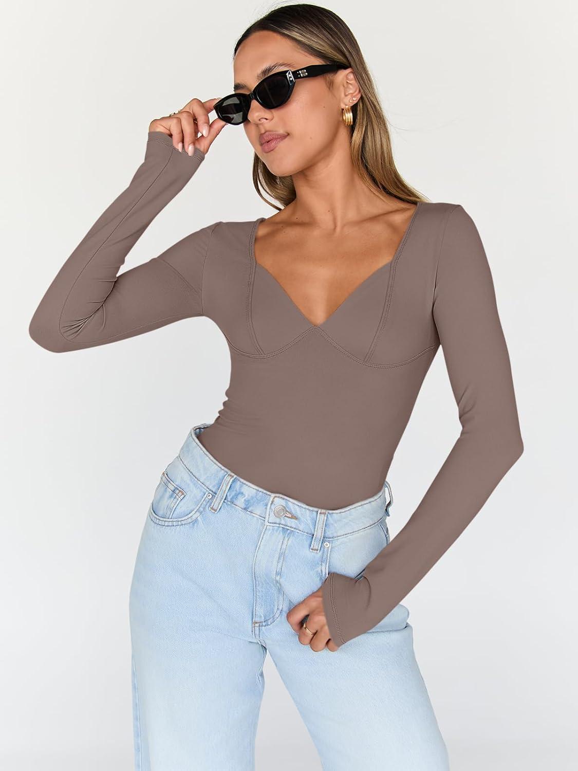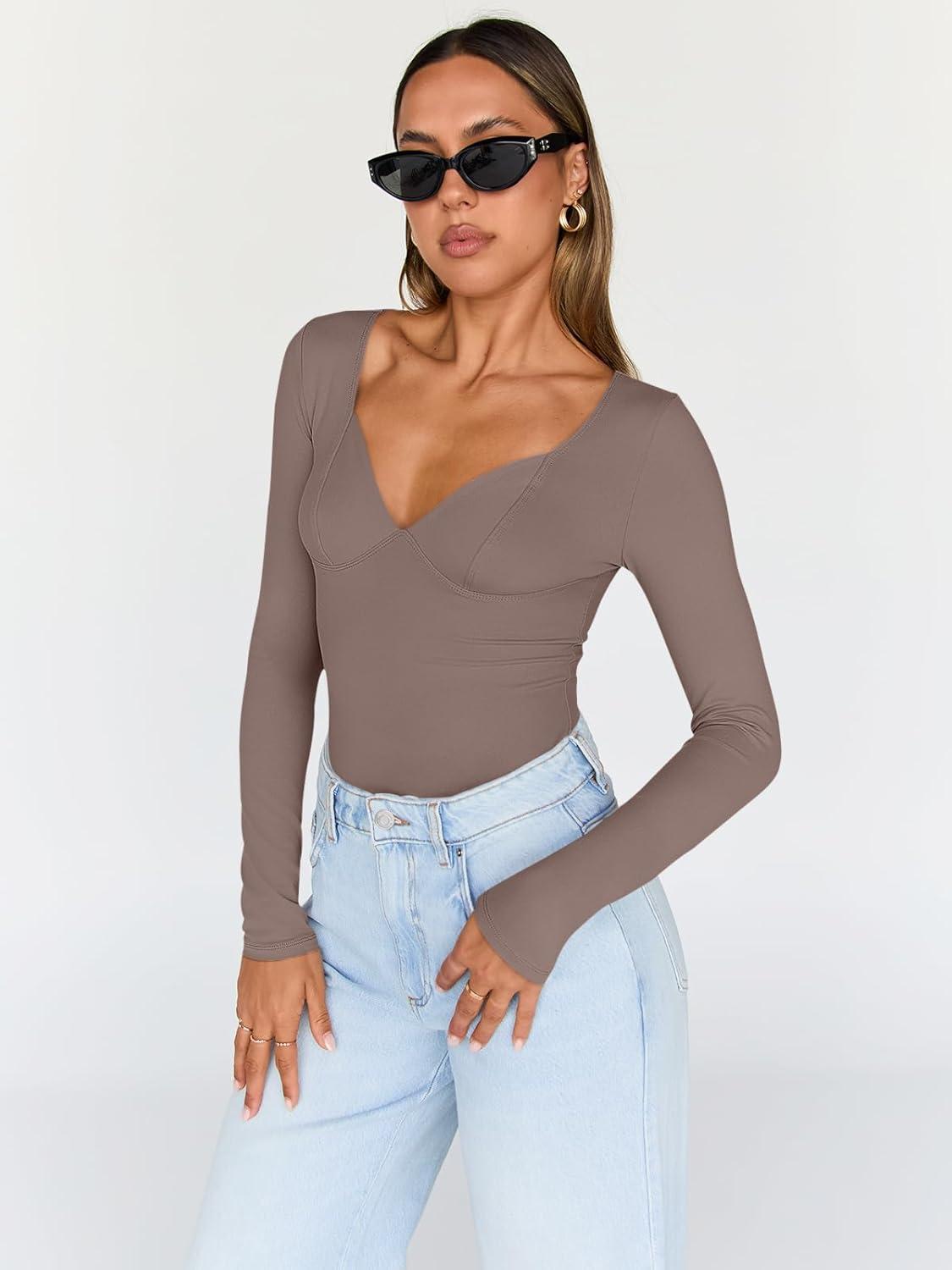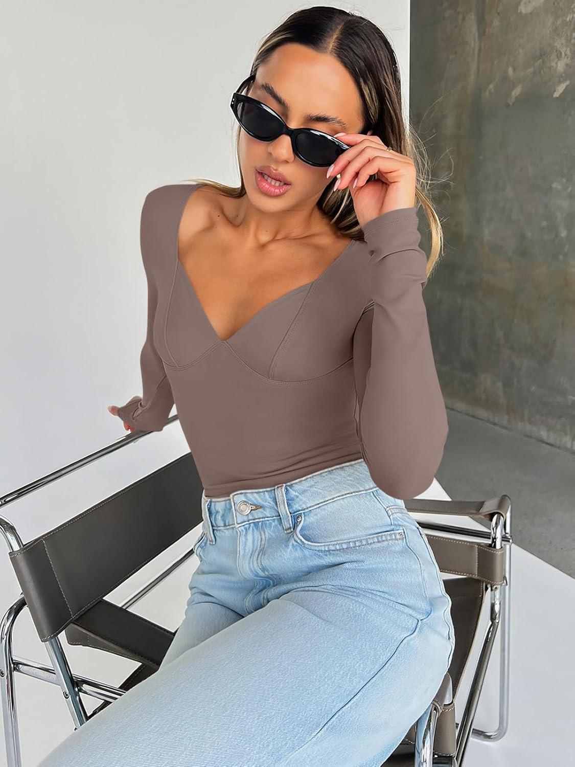Trendy Queen Going Out Tops for Women Trendy Long Sleeve Shirts Fashion Clothing V Neck Basic Y2K Clothes Cute Shirt Corset(Coffee Grey)