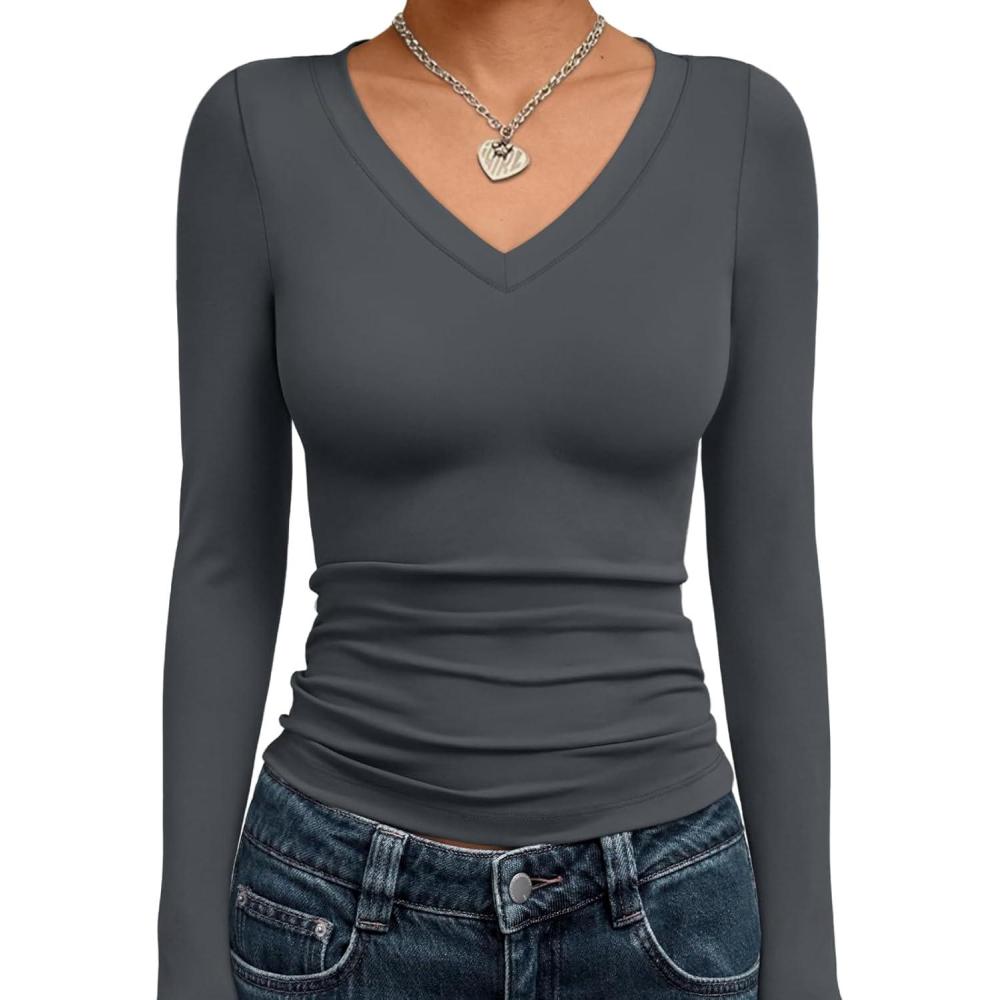 Trendy Queen Long Sleeve Shirts for Women 2025 Fall Fashion V Neck Basics Crop Tops Slim Fitted Y2K Tops Outfits Clothes(Gray)