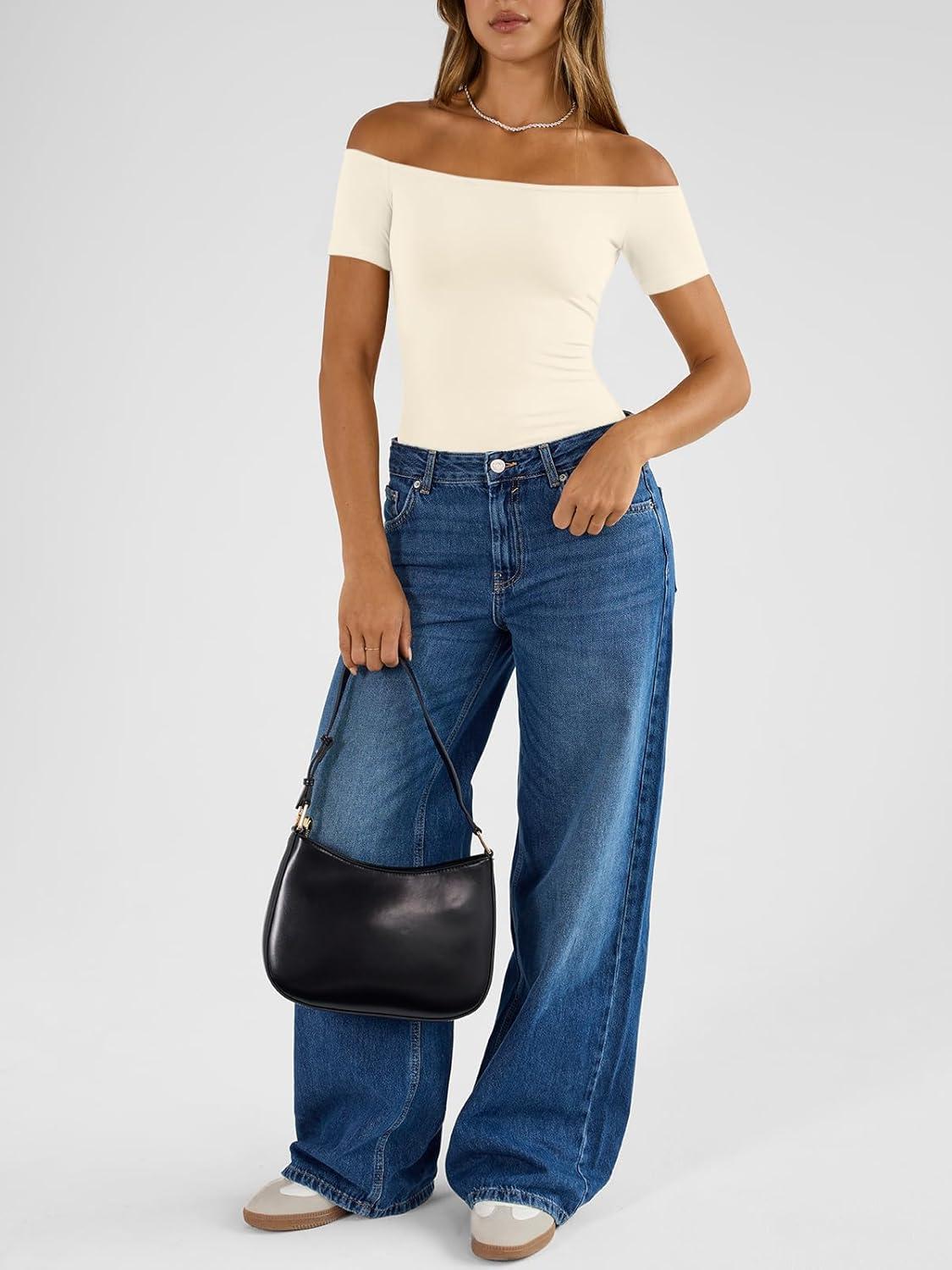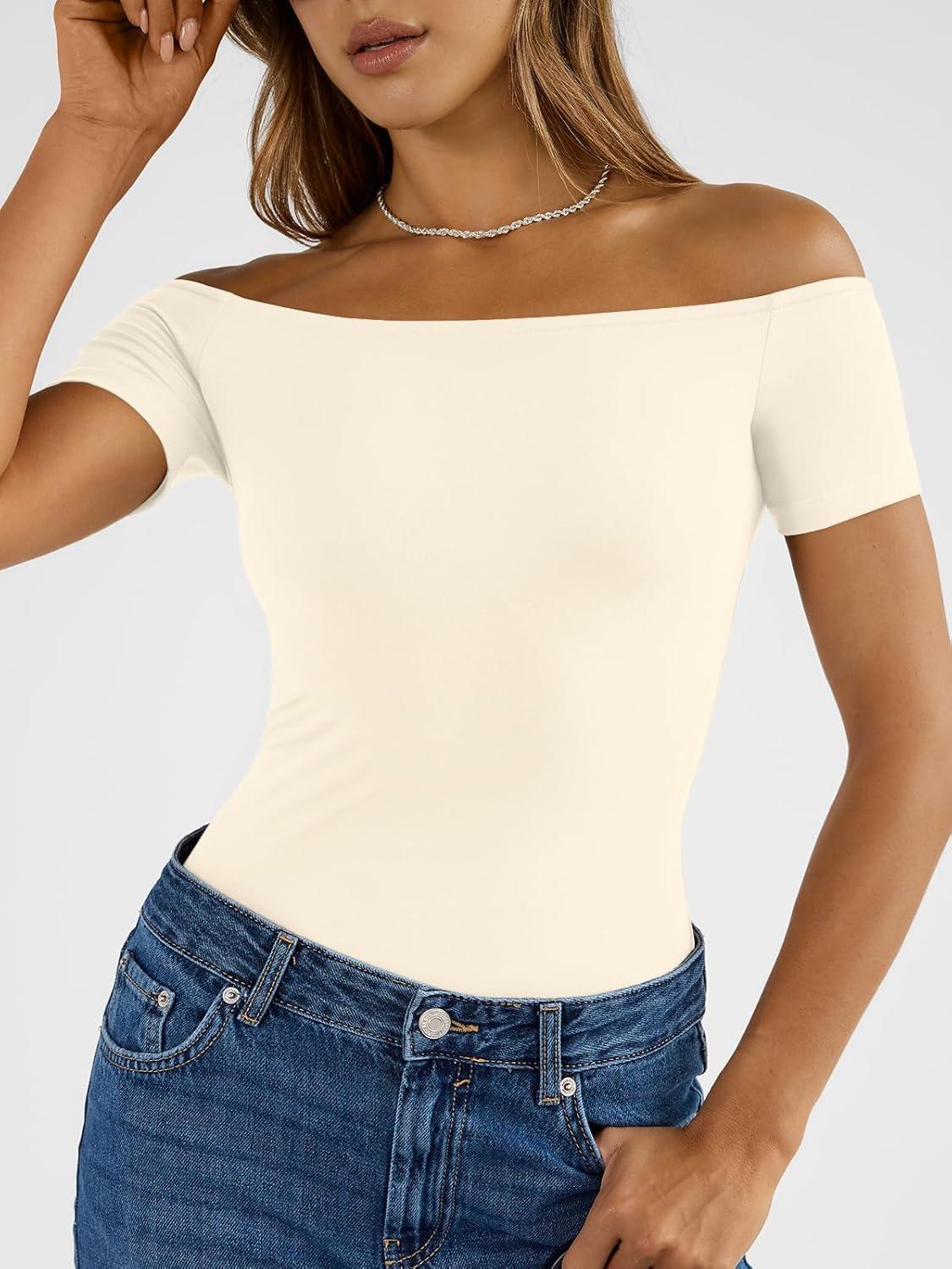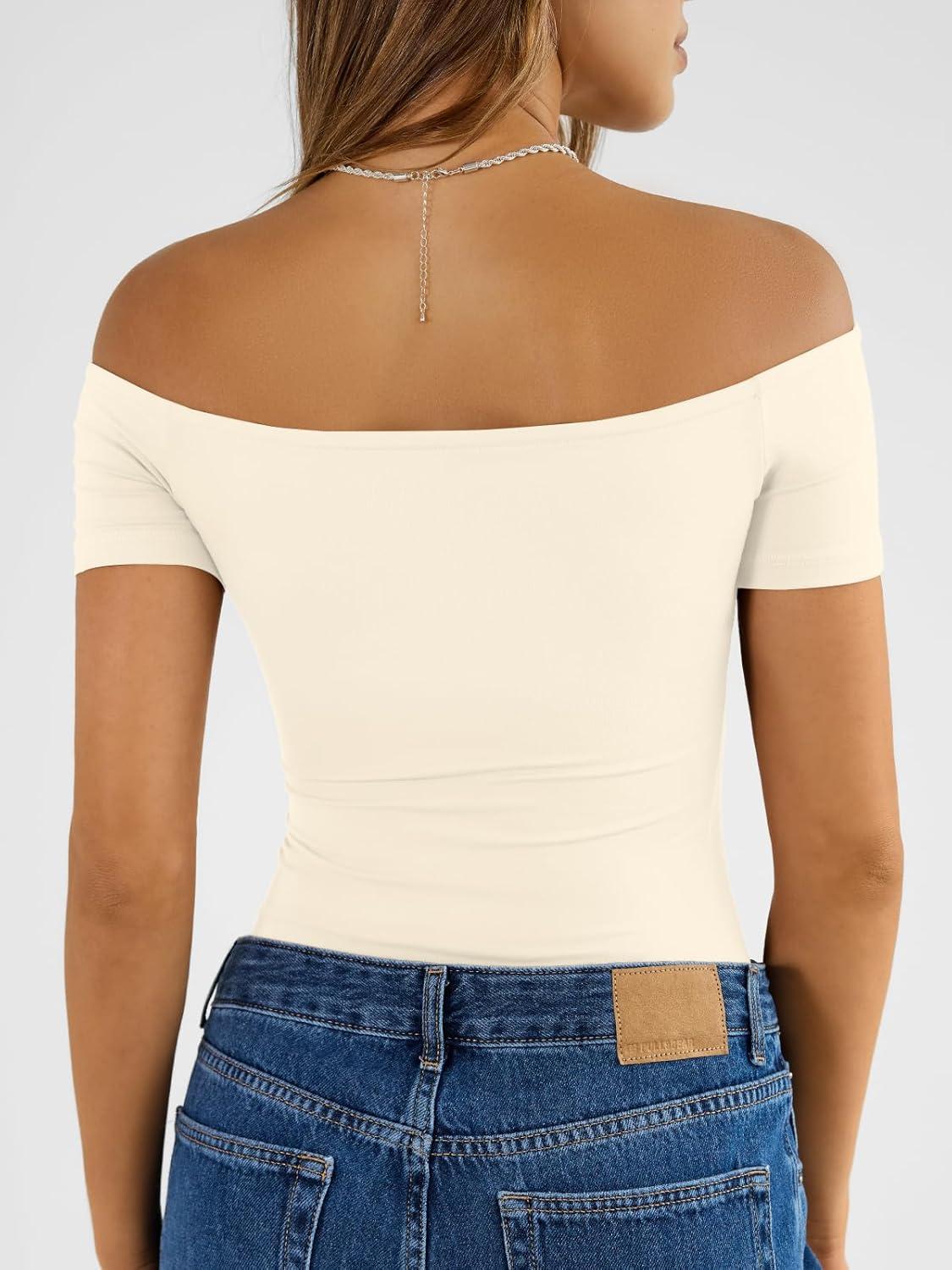 Trendy Queen Summer Off The Shoulder Tops for Women Going Out Short Sleeve Shirts Cute Y2K Sexy Basic Clothes 2026 Fashion(Apricot)