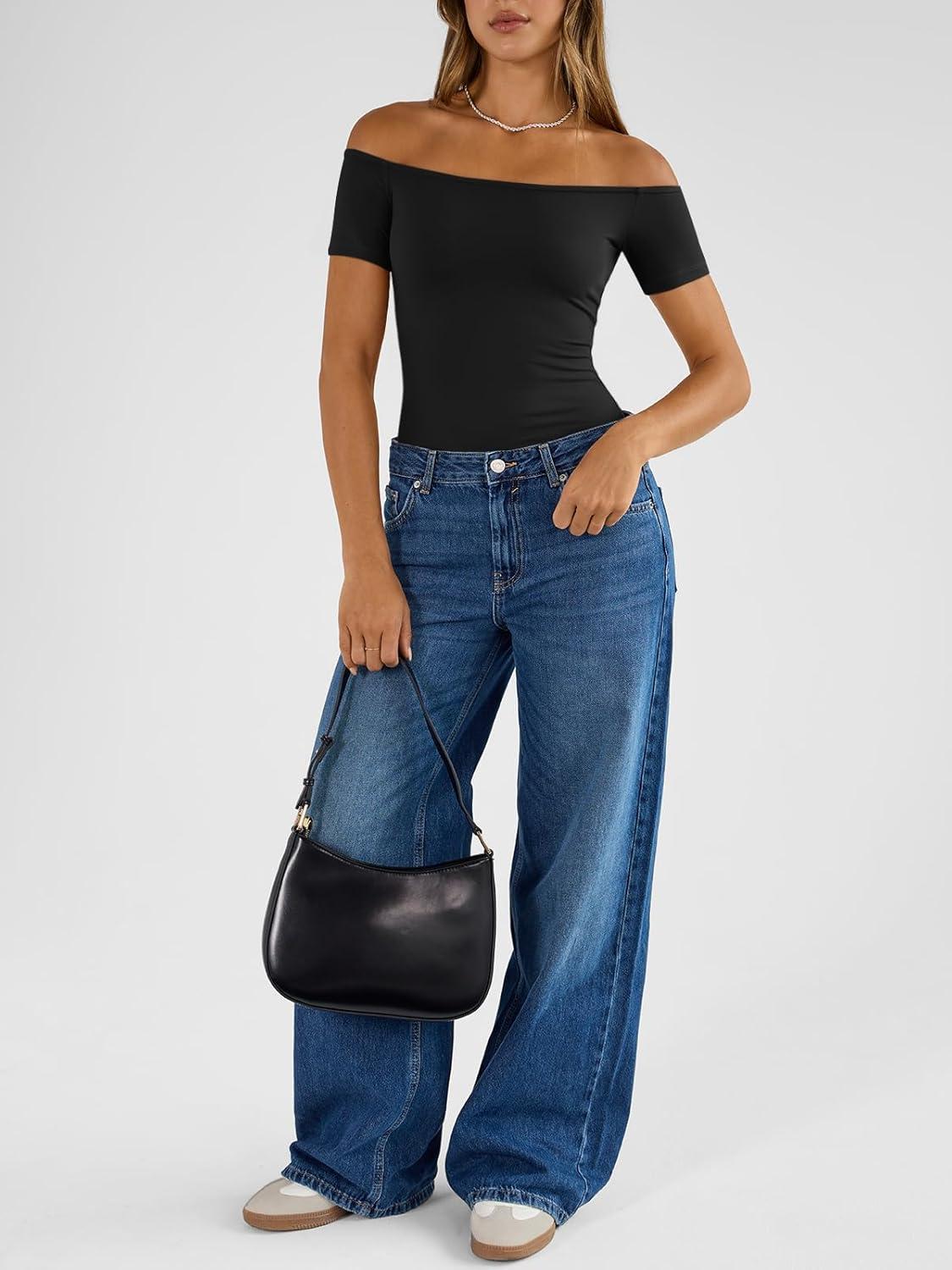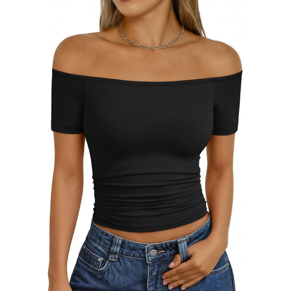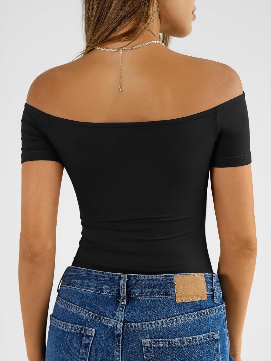 image:imageTrendy Queen Summer Off The Shoulder Tops for Women Going Out Short Sleeve Shirts Cute Y2K Sexy Basic Clothes 2026 FashionBlack