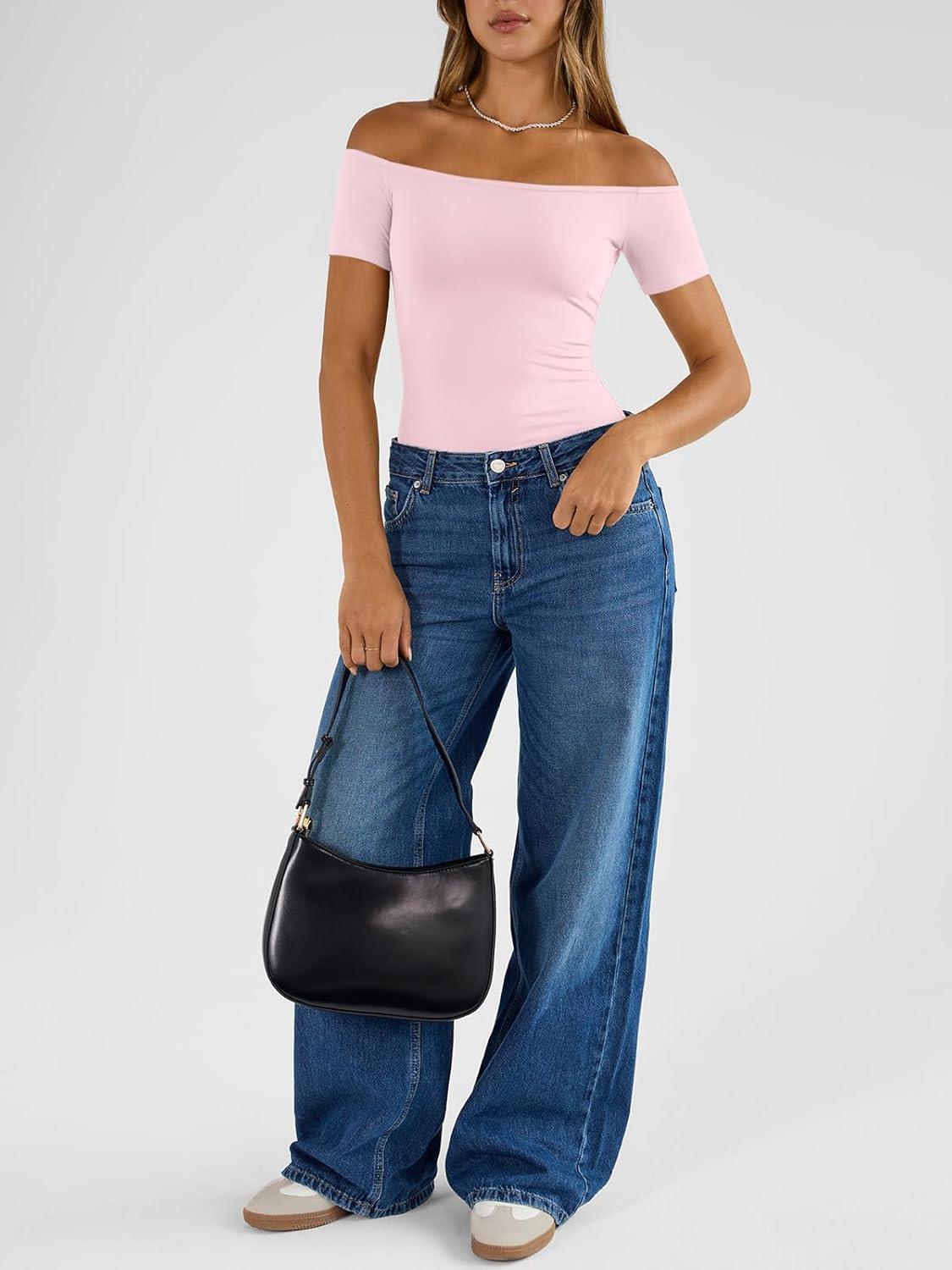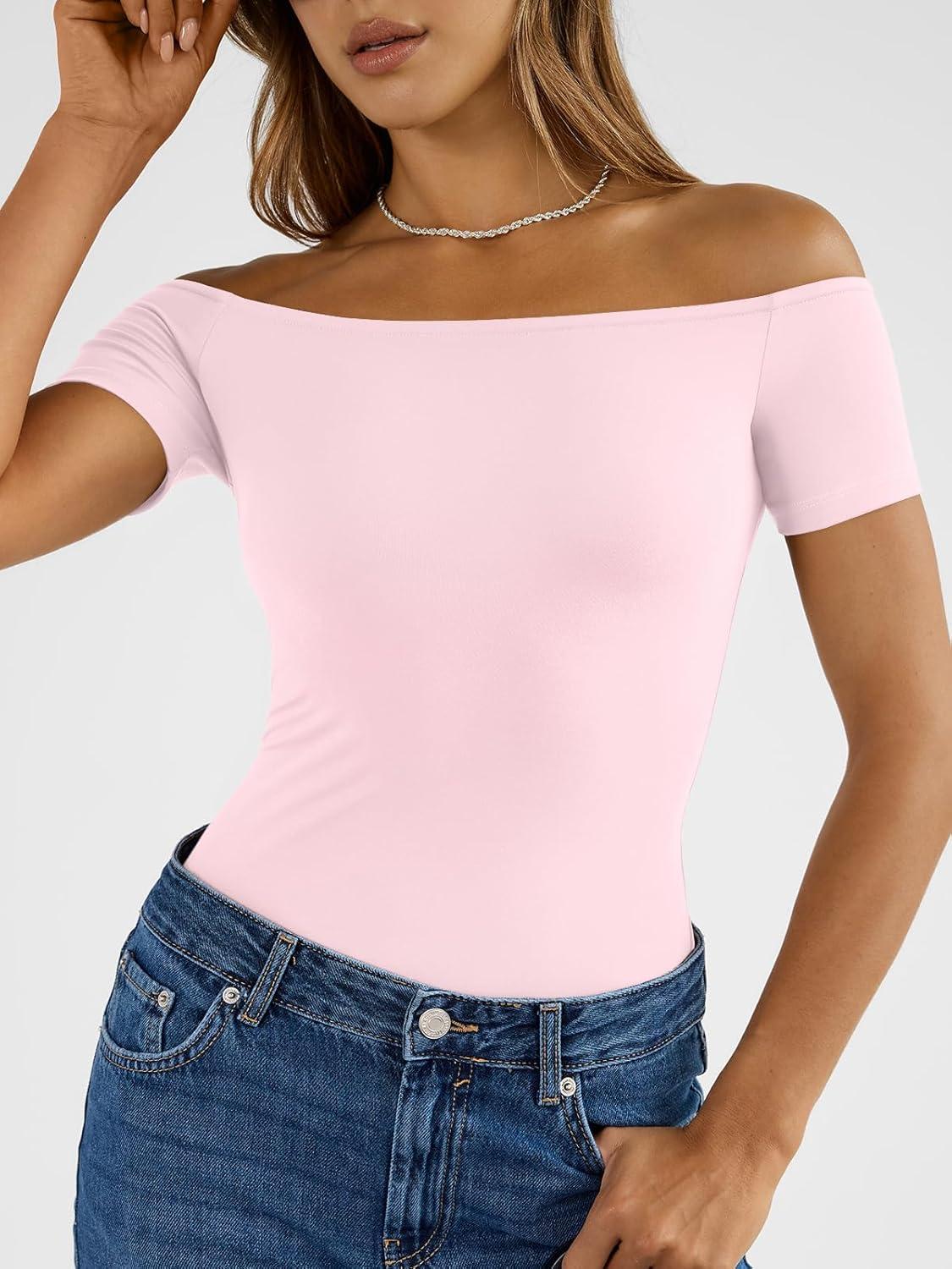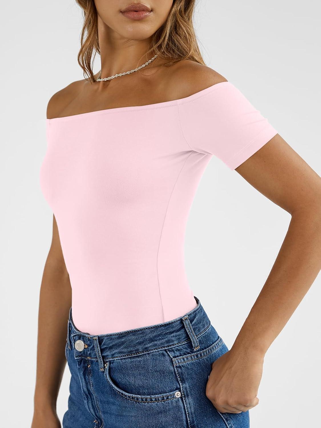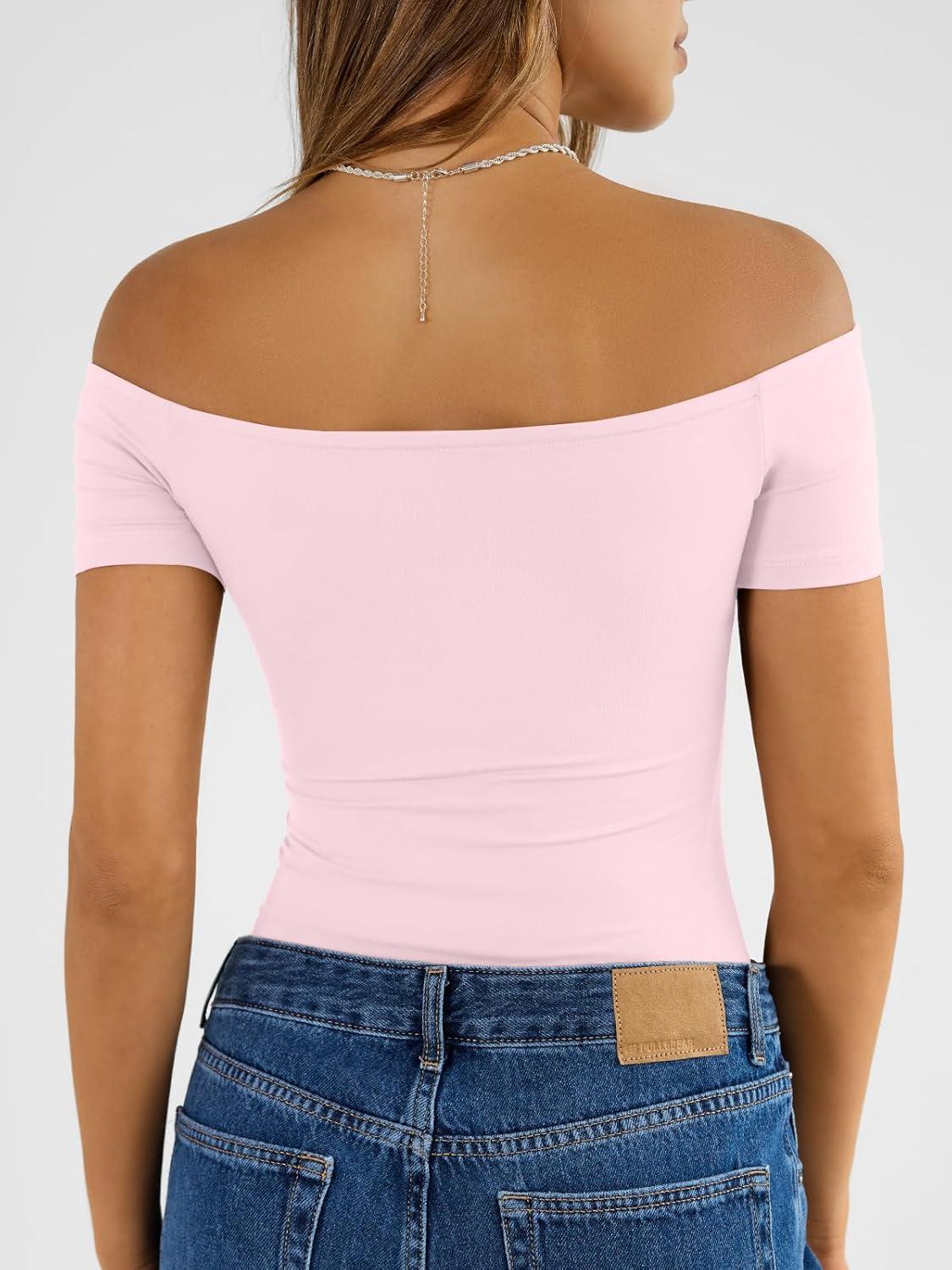 Trendy Queen Summer Off The Shoulder Tops for Women Going Out Short Sleeve Shirts Cute Y2K Sexy Basic Clothes 2026 Fashion(Pink)