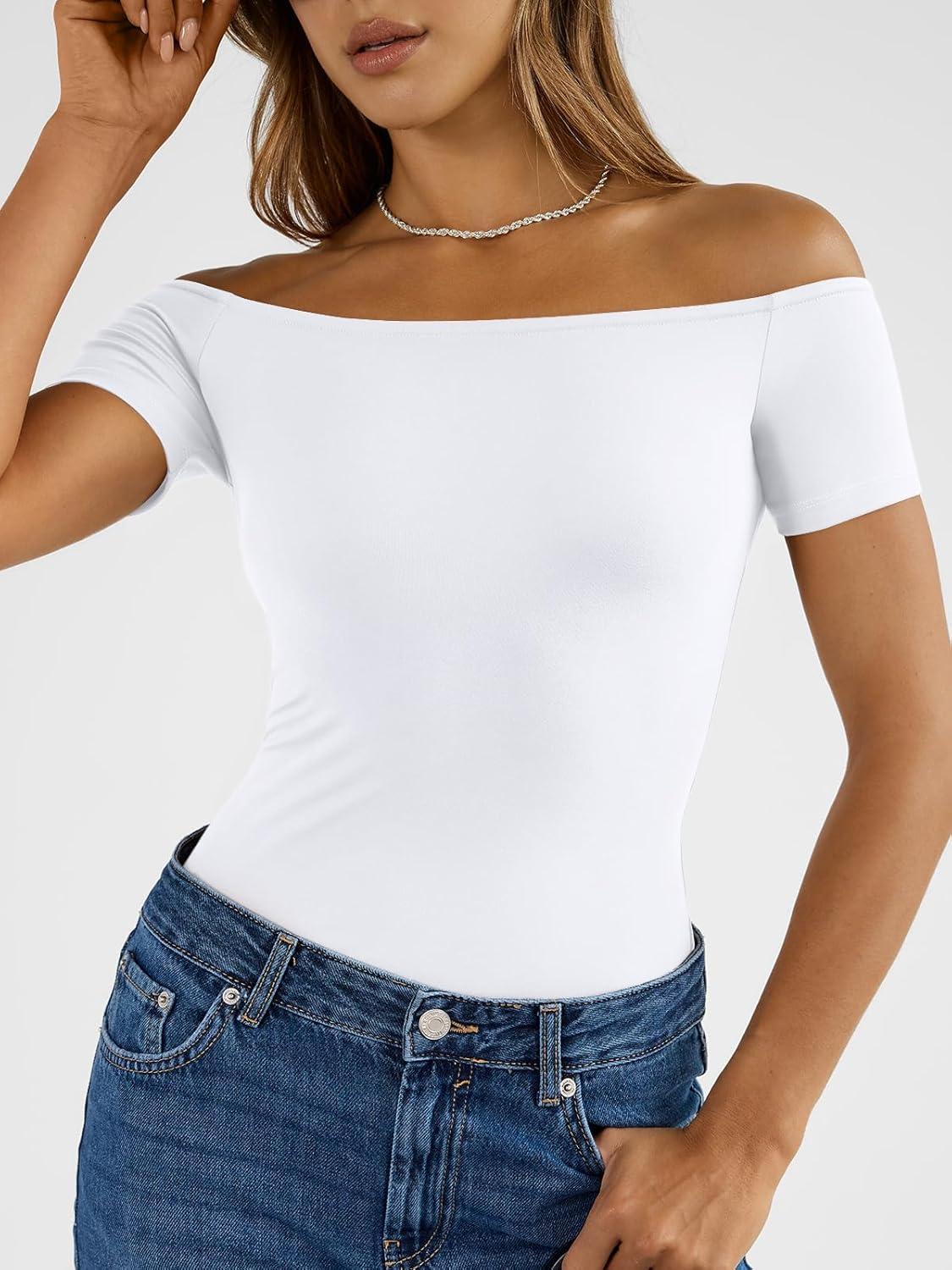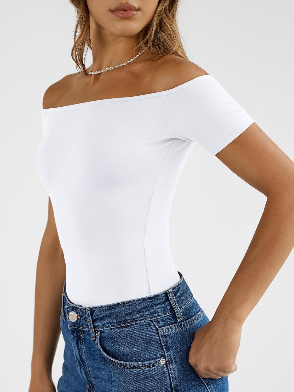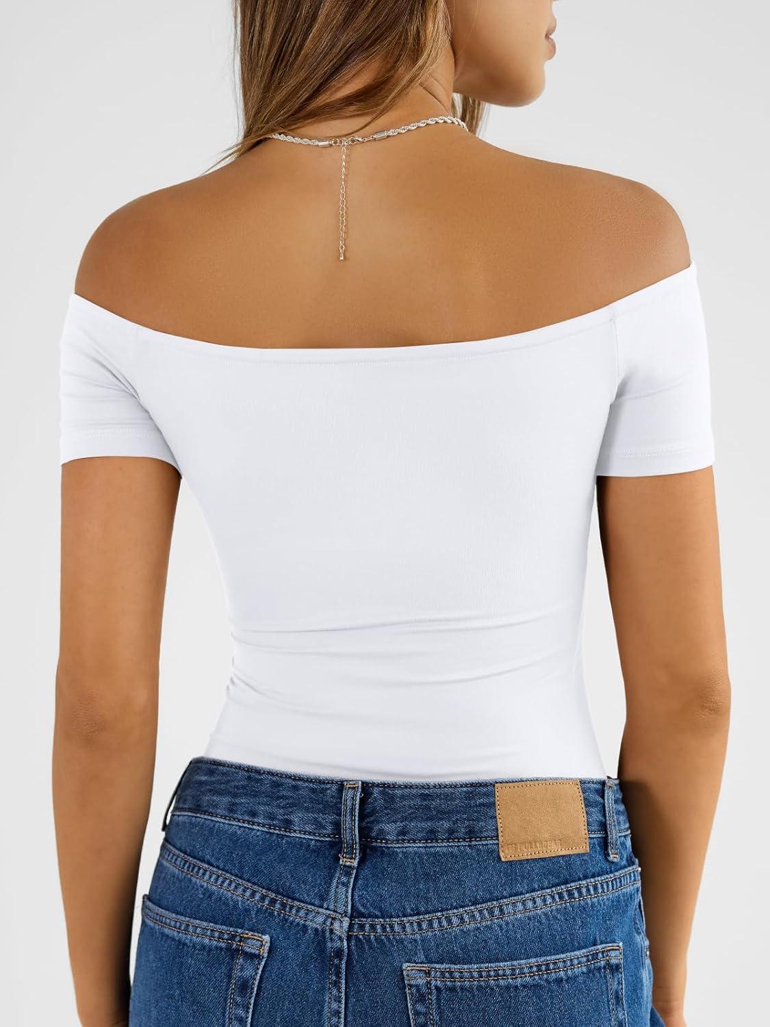 image:imageTrendy Queen Summer Off The Shoulder Tops for Women Going Out Short Sleeve Shirts Cute Y2K Sexy Basic Clothes 2026 FashionWhite