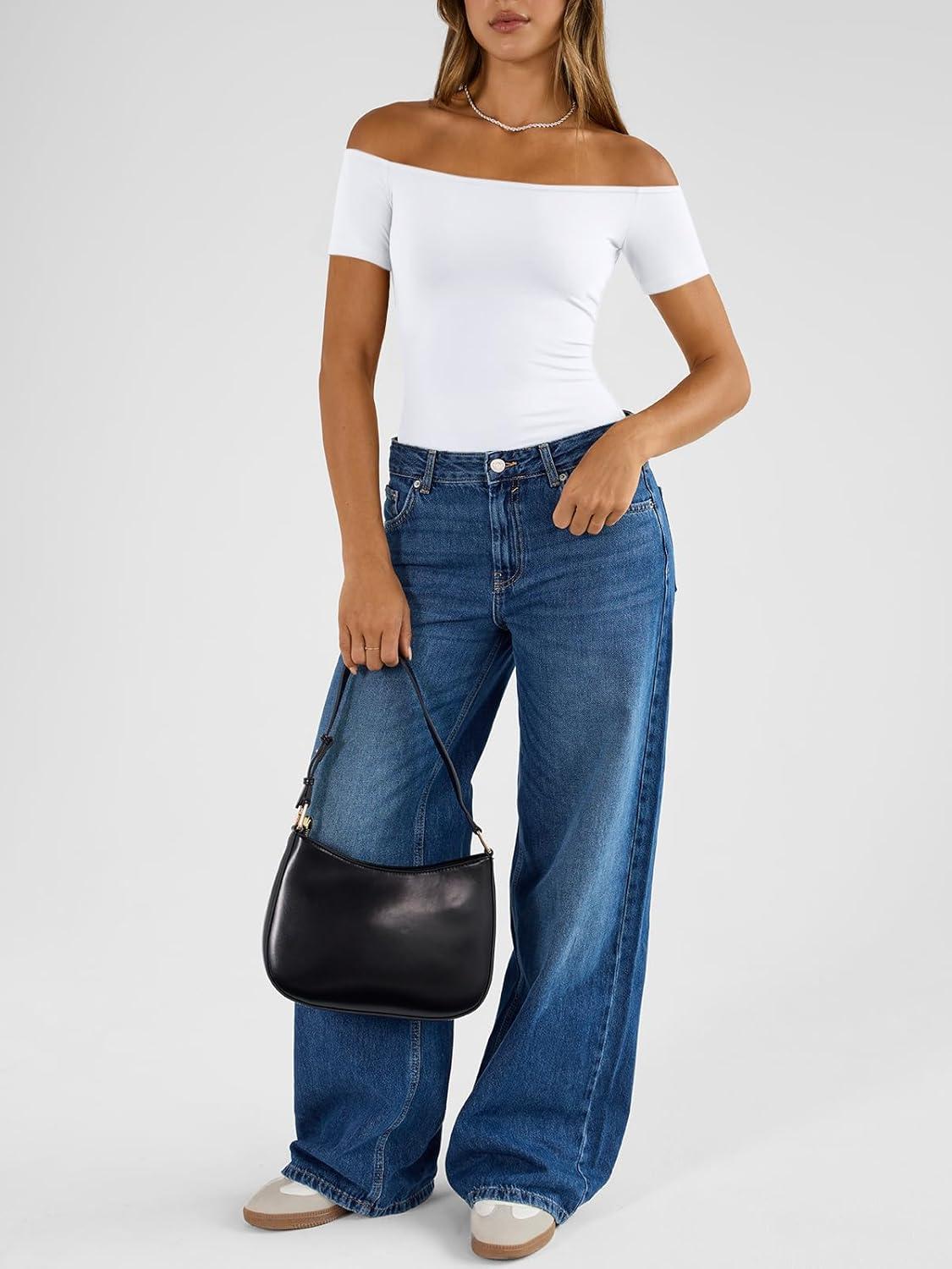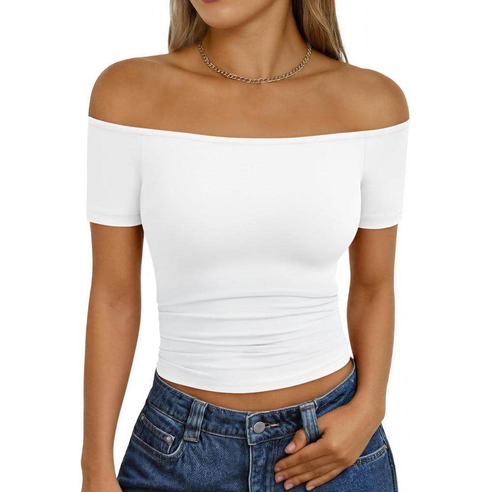 Trendy Queen Summer Off The Shoulder Tops for Women Going Out Short Sleeve Shirts Cute Y2K Sexy Basic Clothes 2026 Fashion(White)