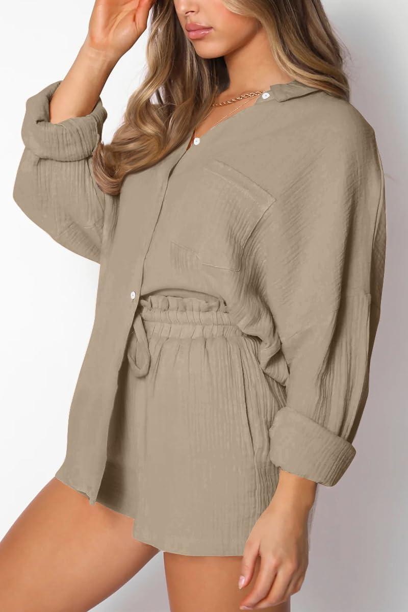 Trendy Queen Two Piece Sets For Women Summer Short Sets Beach Vcation Lounge Pajama 2 Piece Spring Outfits Fashion 2025(Beige)