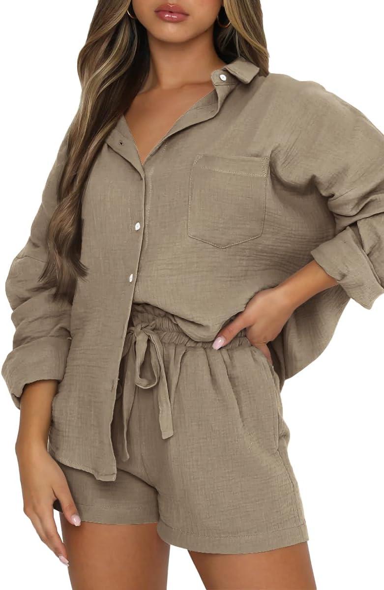 Trendy Queen Two Piece Sets For Women Summer Short Sets Beach Vcation Lounge Pajama 2 Piece Spring Outfits Fashion 2025(Coffeegrey)