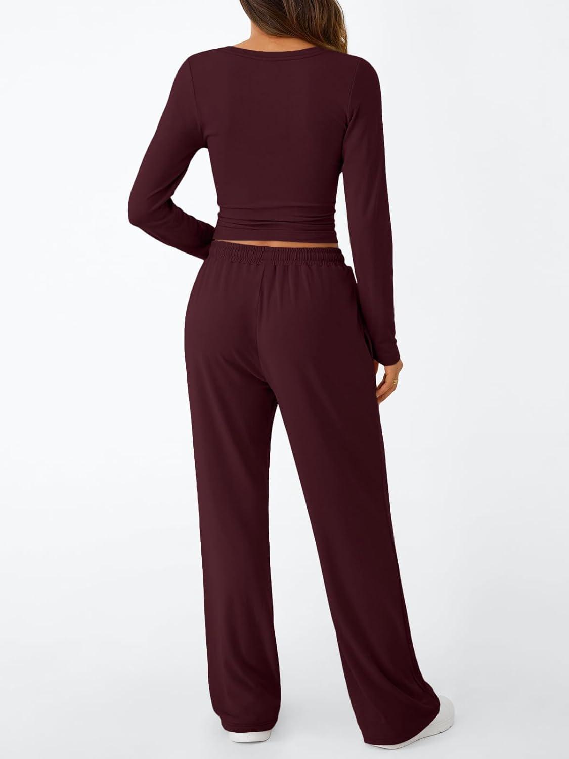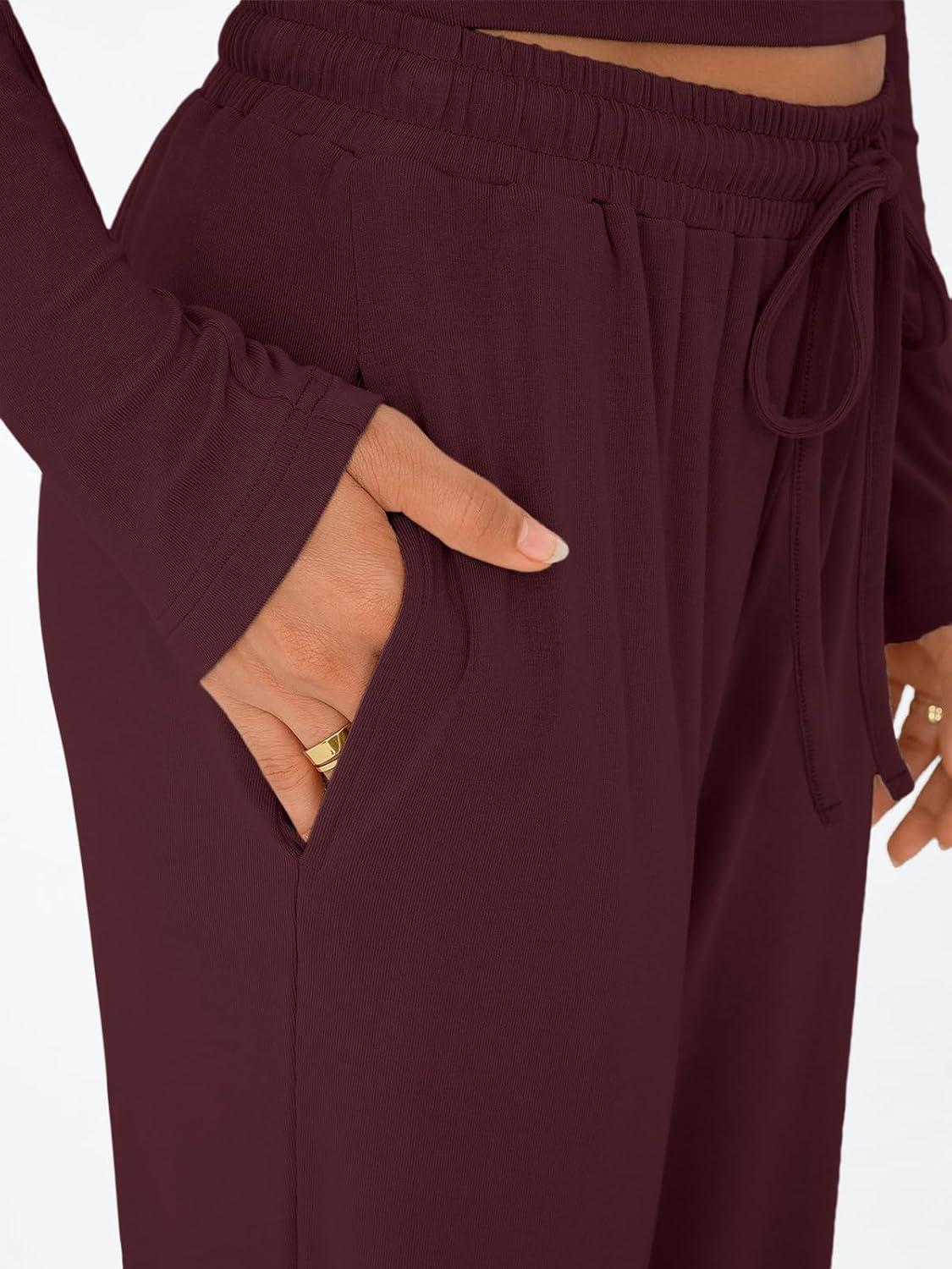 Trendy Queen Women's 2 Piece Matching Lounge Set Long Sleeve Slightly Crop Top Wide Leg Pants Casual Sweatsuit(Wine)