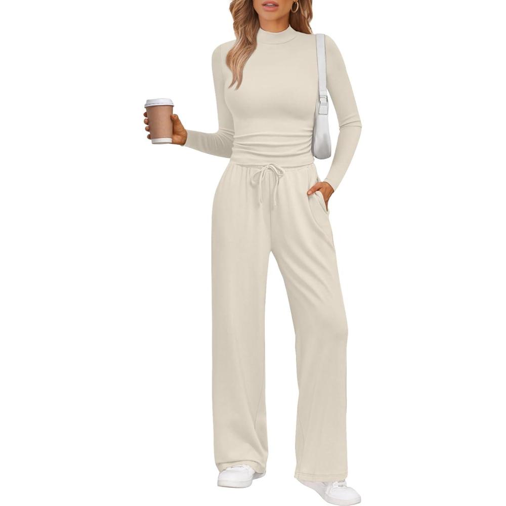 Trendy Queen Womens 2 Piece Matching Lounge Set Mock Turtleneck Top Wide Leg Pants Casual Sweatsuit with Pockets(Apricot)