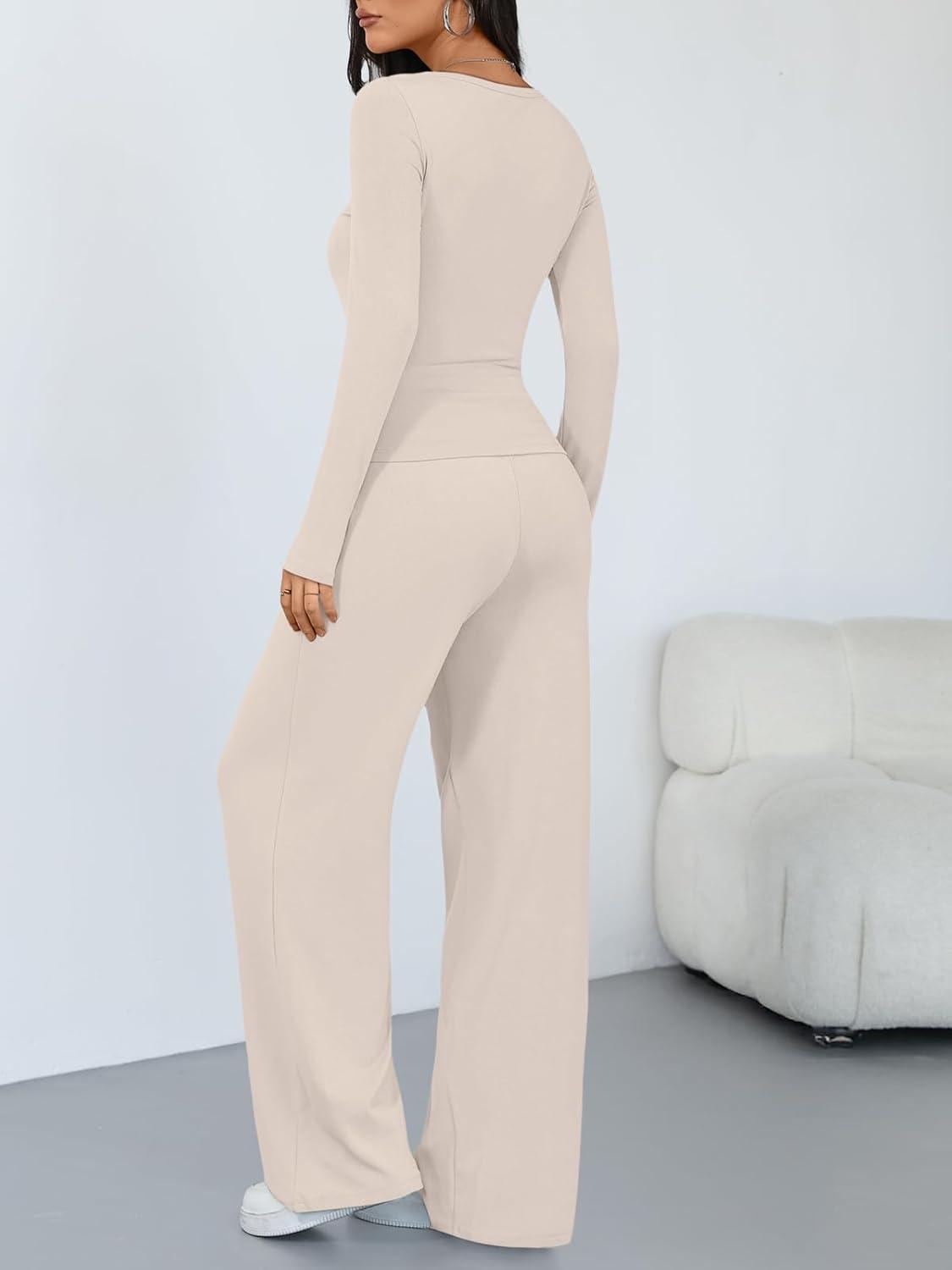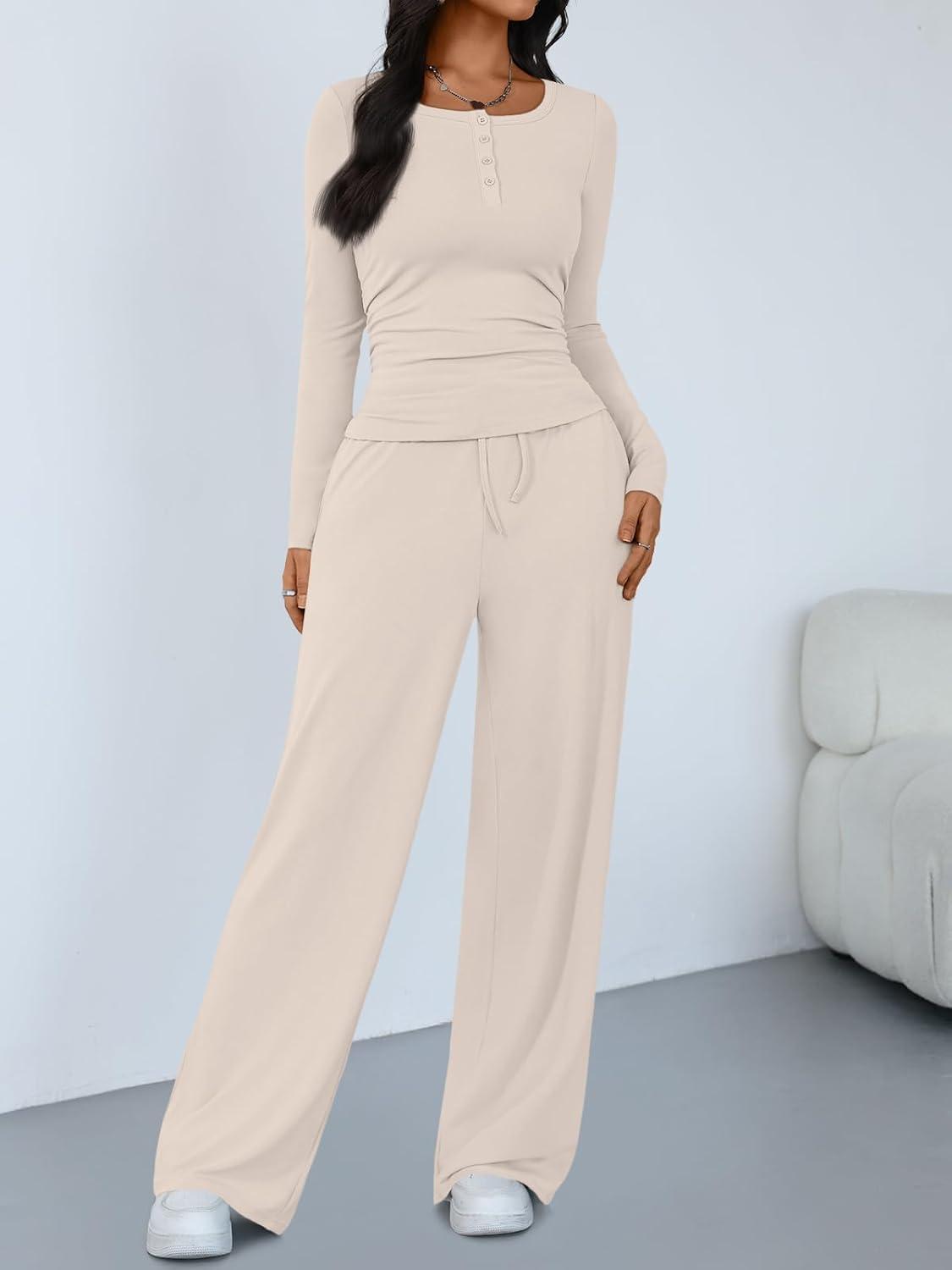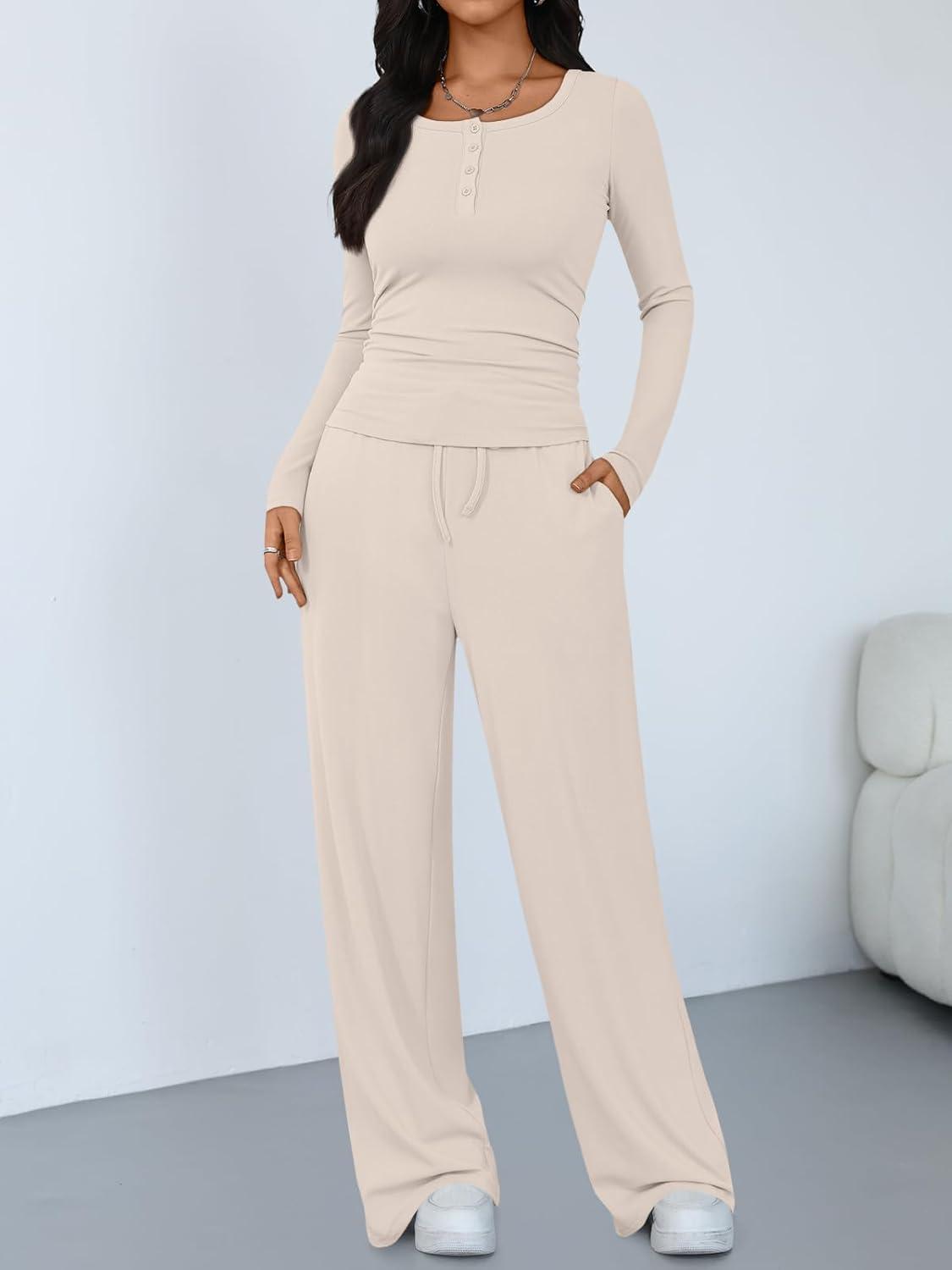 Trendy Queen Women’s 2 Piece Matching Lounge Sets Long Sleeve Henley Neck Slightly Crop Top Wide Leg Pants Casual Sweat Suit(Beige)