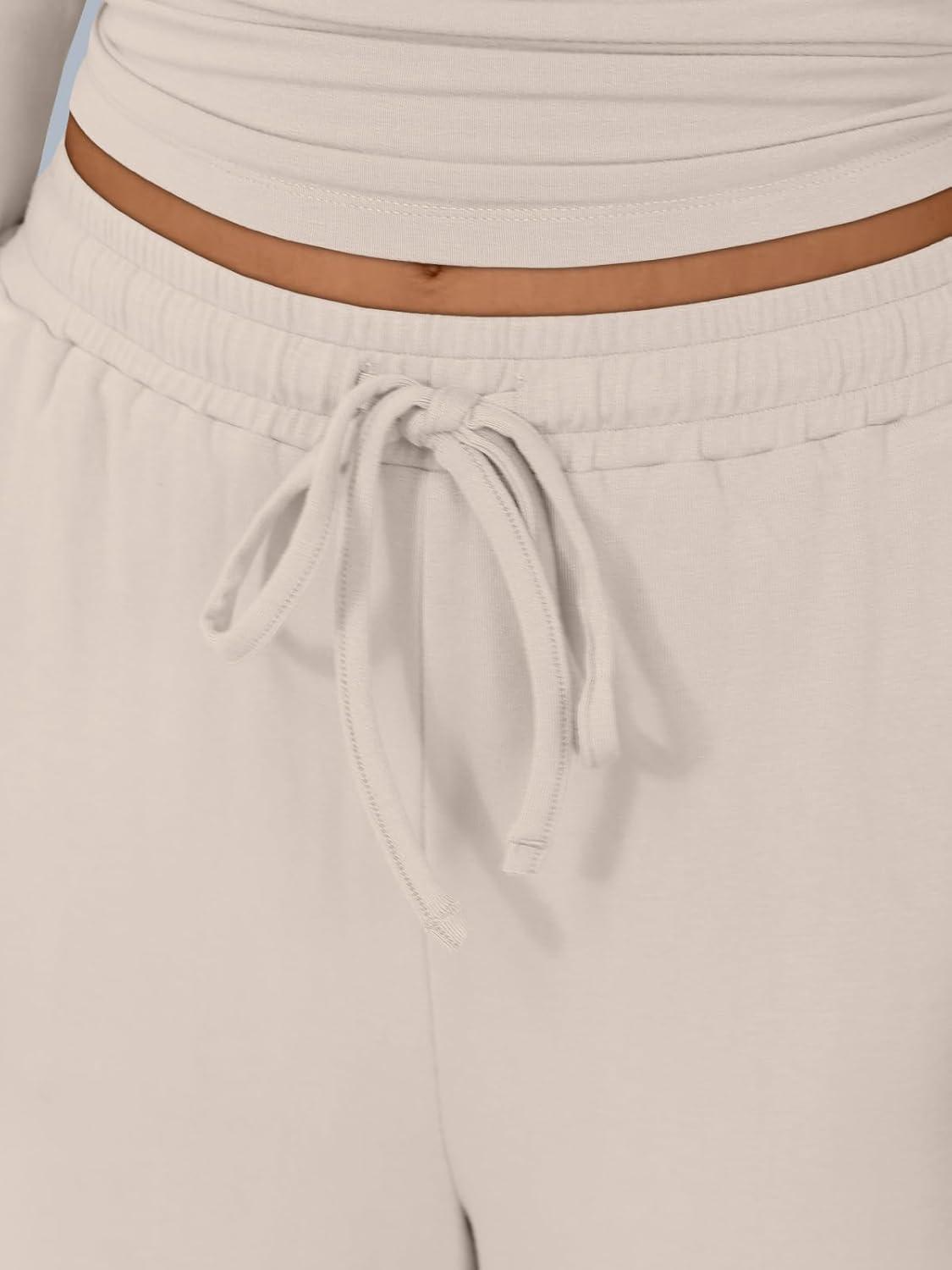 Trendy Queen Women's 2 Piece Matching Lounge Sets Long Sleeve Henley Neck Slightly Crop Top Wide Leg Pants Casual Sweat Suit(Beige)