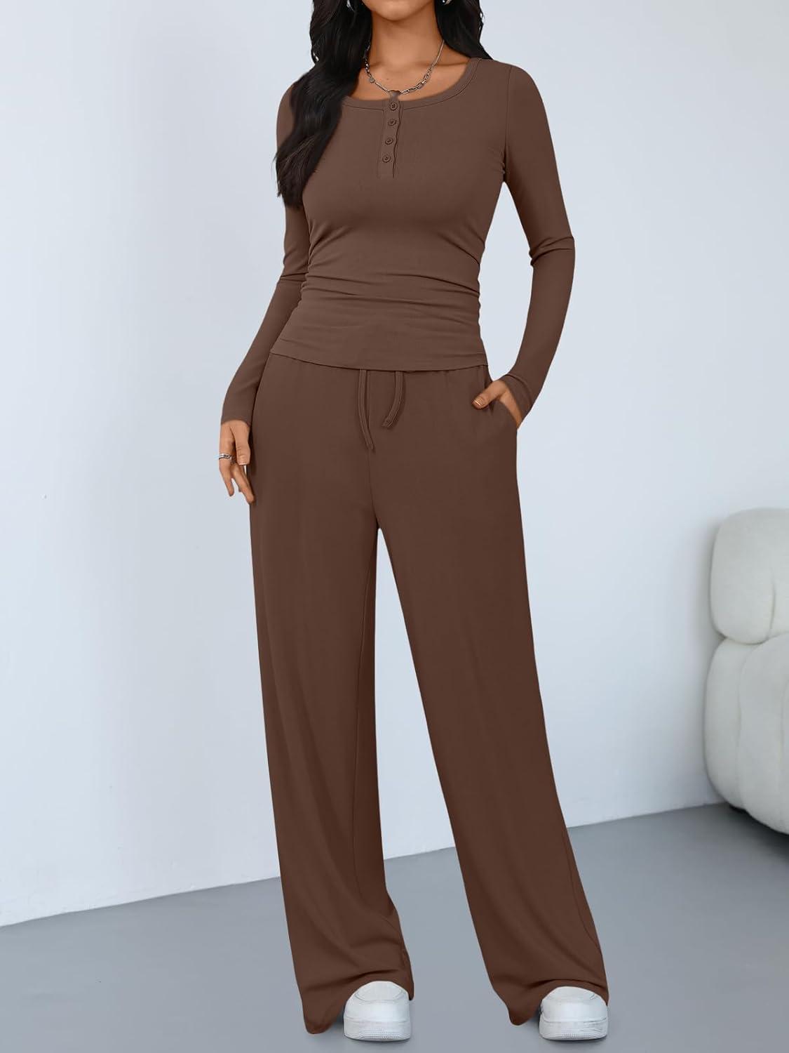 Trendy Queen Women’s 2 Piece Matching Lounge Sets Long Sleeve Henley Neck Slightly Crop Top Wide Leg Pants Casual Sweat Suit(Cocoa)