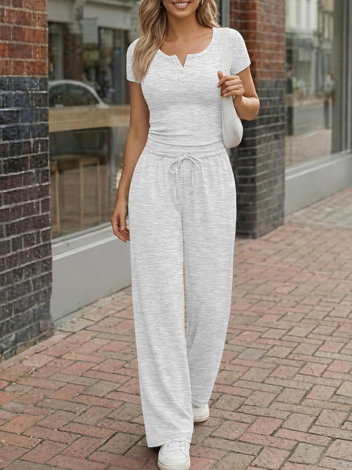 Trendy Queen Women's 2 Piece Matching Lounge Sets Summer Henley Neck Slightly Crop Top Wide Leg Pants Casual Sweat Suit(Oatmeal Grey)